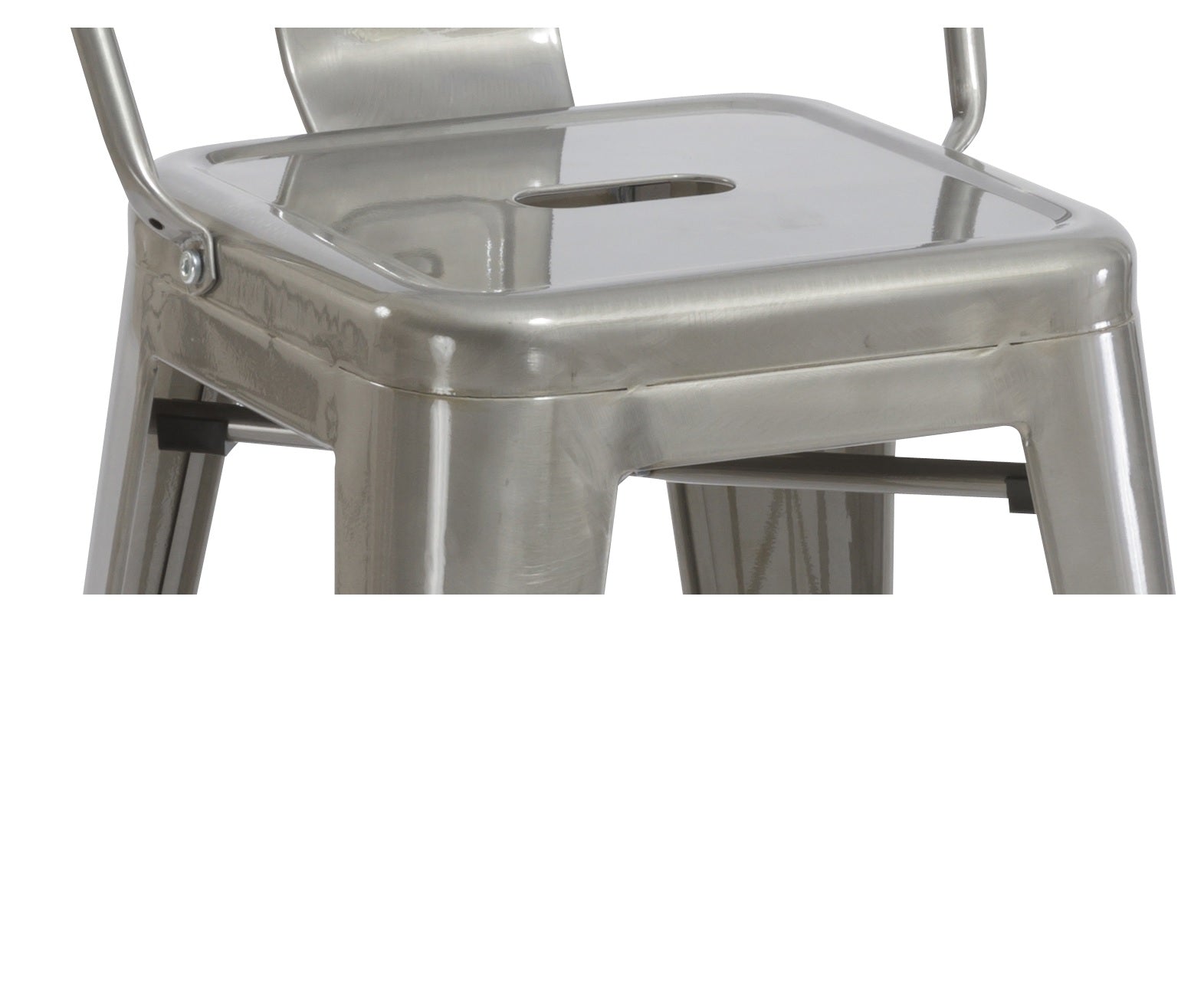 | Design Elements | Tapered, slender metal legs with integrated cross – braces; seat with small rectangular cutout; backrest with vertical panel featuring decorative V – shaped groove and curved top rail; rubber foot caps on legs |