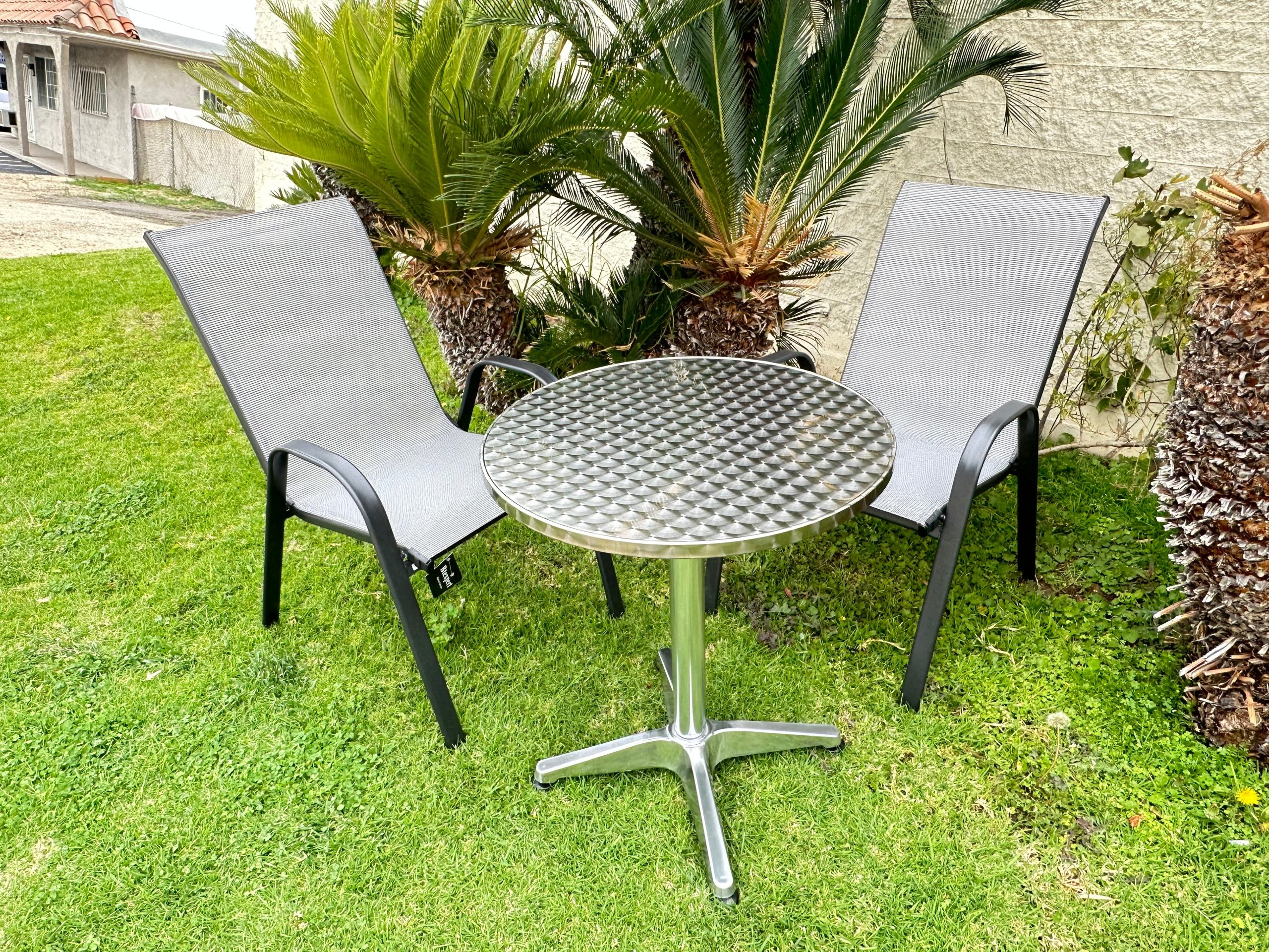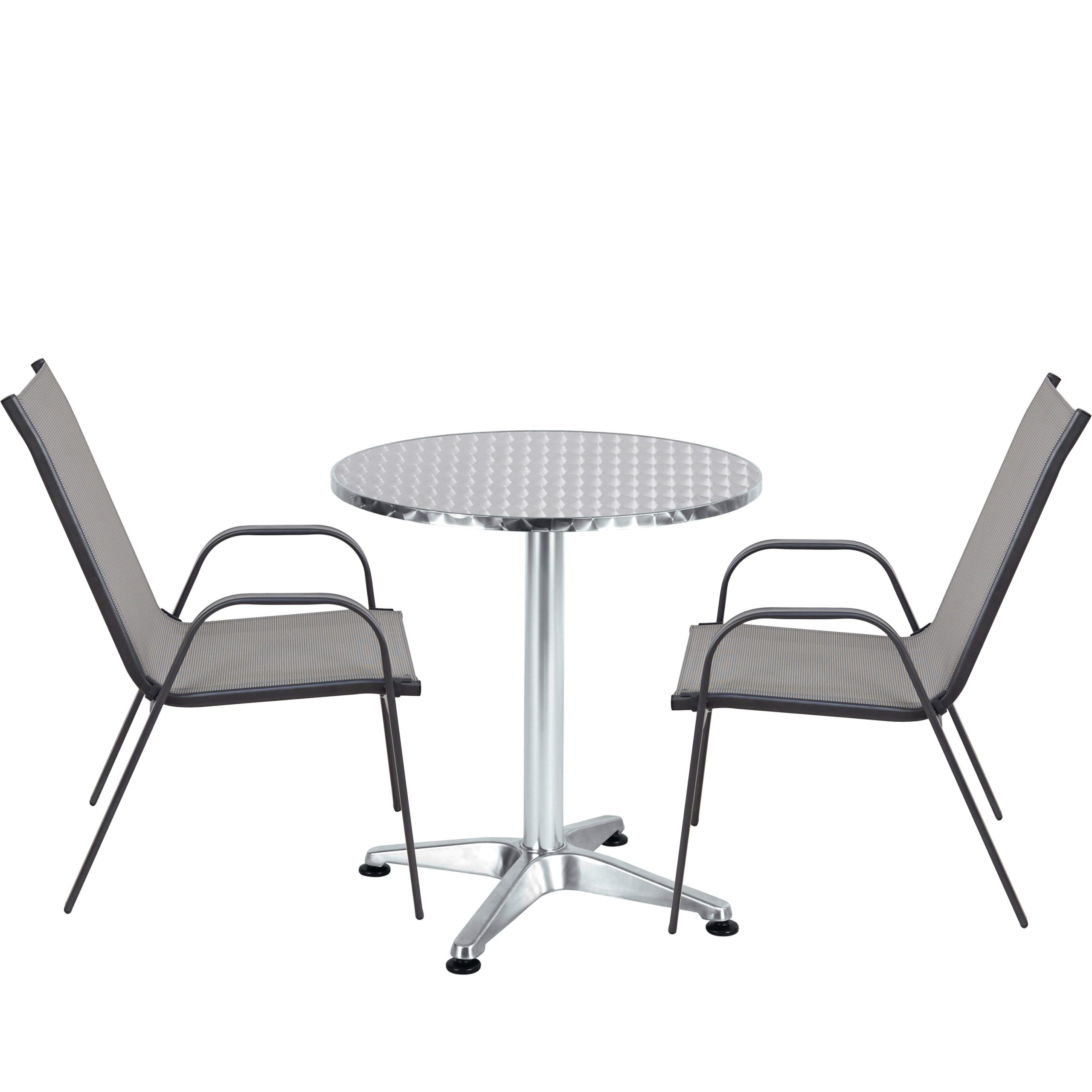 This bistro-style outdoor seating set is perfect for small outdoor spaces. It comes with two chairs and a round table, creating a cozy spot for casual dining and socializing.