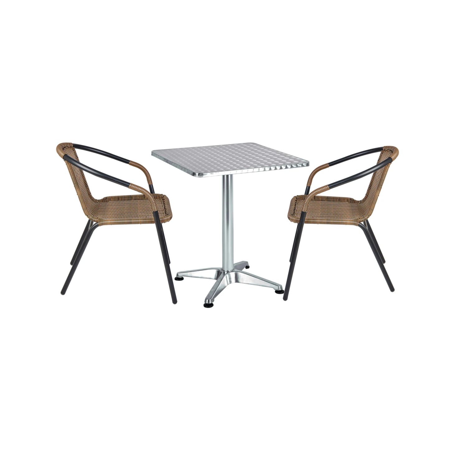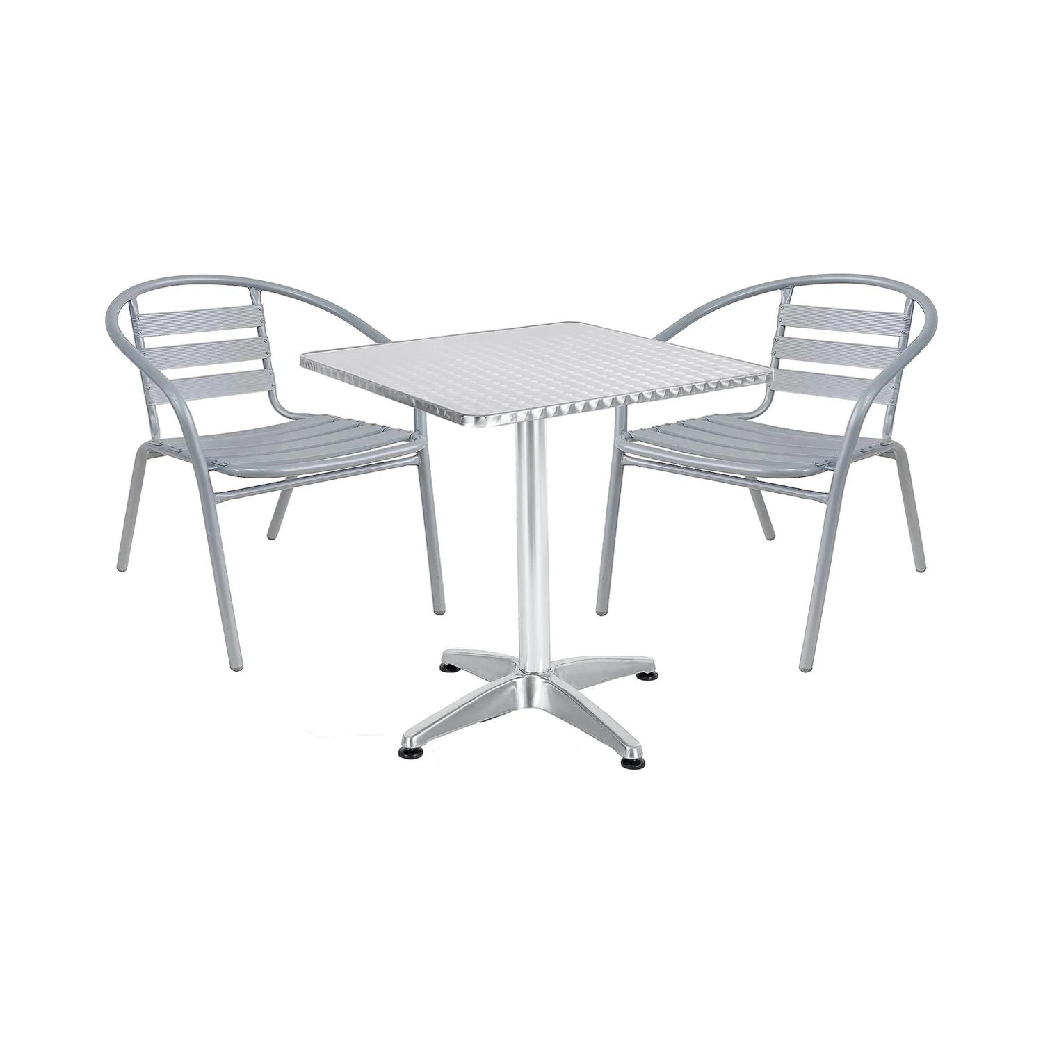 This outdoor patio furniture set includes a small square table and two matching chairs. It is designed for casual dining and relaxation in outdoor spaces like patios, balconies, and gardens. With a modern aesthetic, it offers a great addition to any outdoor area.