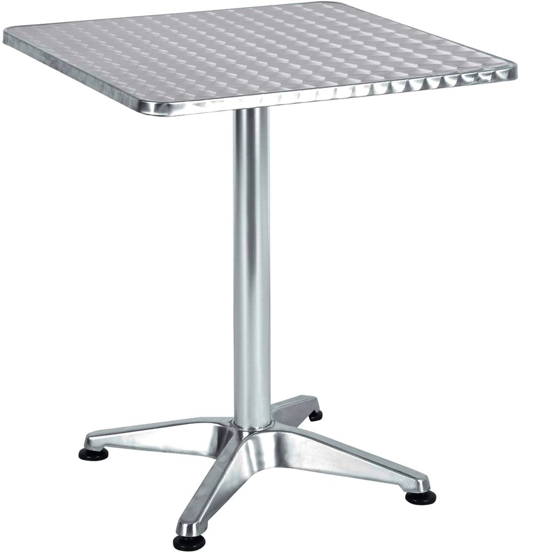 | Table Design | Square with diamond – plate top, smooth metallic finish, starburst (four – legged) base with adjustable feet |