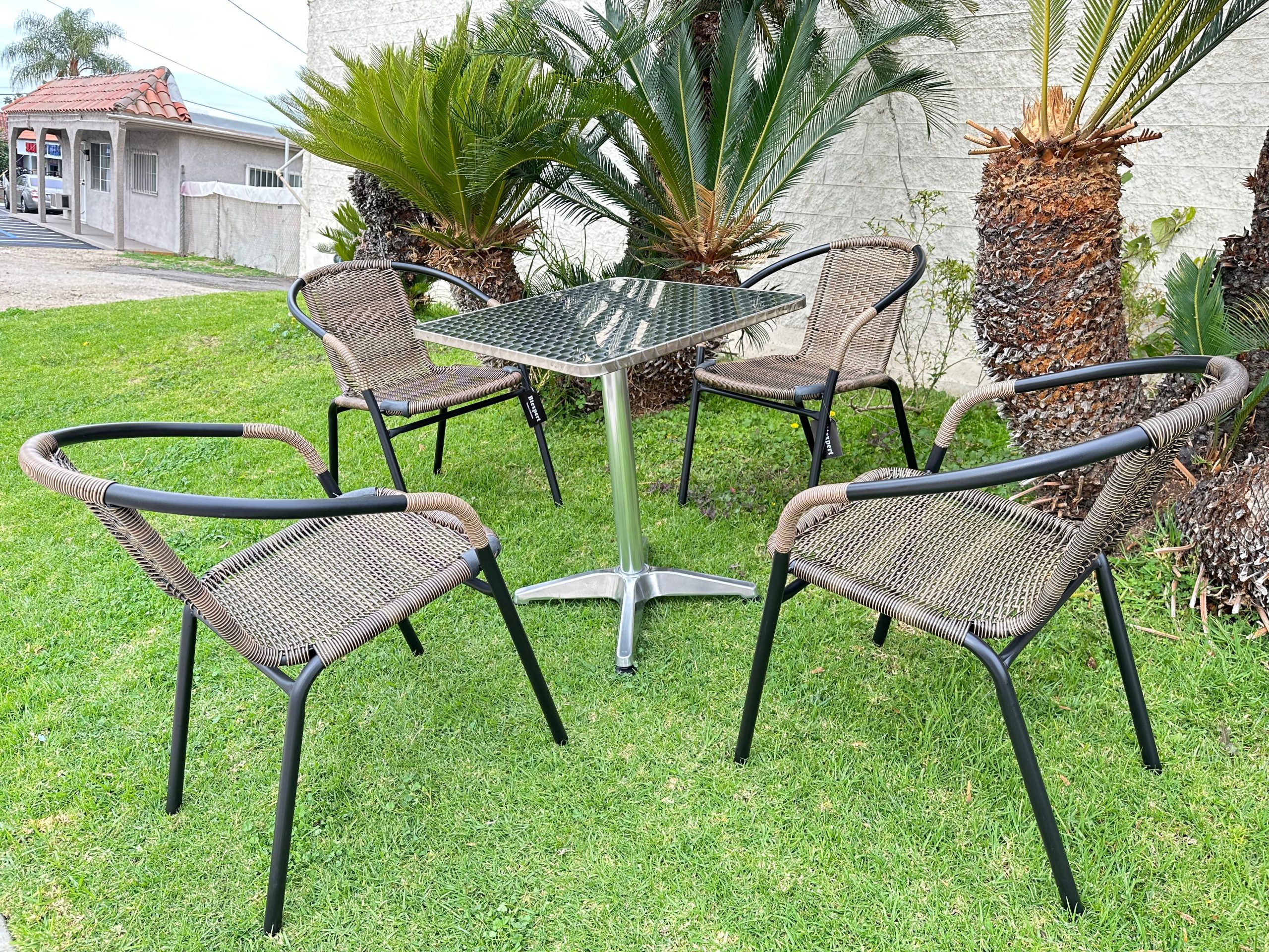 - Wipe the metallic tabletop with a soft, damp cloth to maintain its shiny finish. For the synthetic wicker chairs, gently brush off any dirt and use a mild soap and water solution for deeper cleaning.