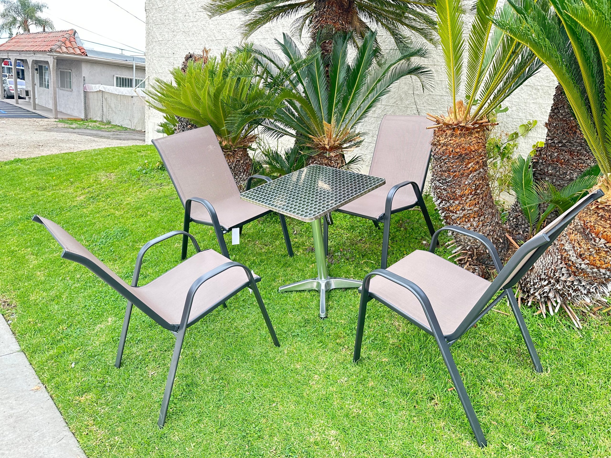 This outdoor patio furniture set is a great addition to small outdoor spaces. It comes with a square table and four matching chairs, offering a comfortable seating solution for up to four people.