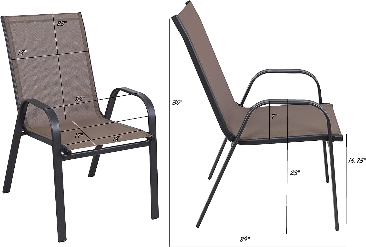 • The chairs are stackable for space – saving, feature weather – resistant fabric that dries quickly and is UV – resistant, and have armrests for comfort and a powder – coated frame that is rust and scratch – proof.