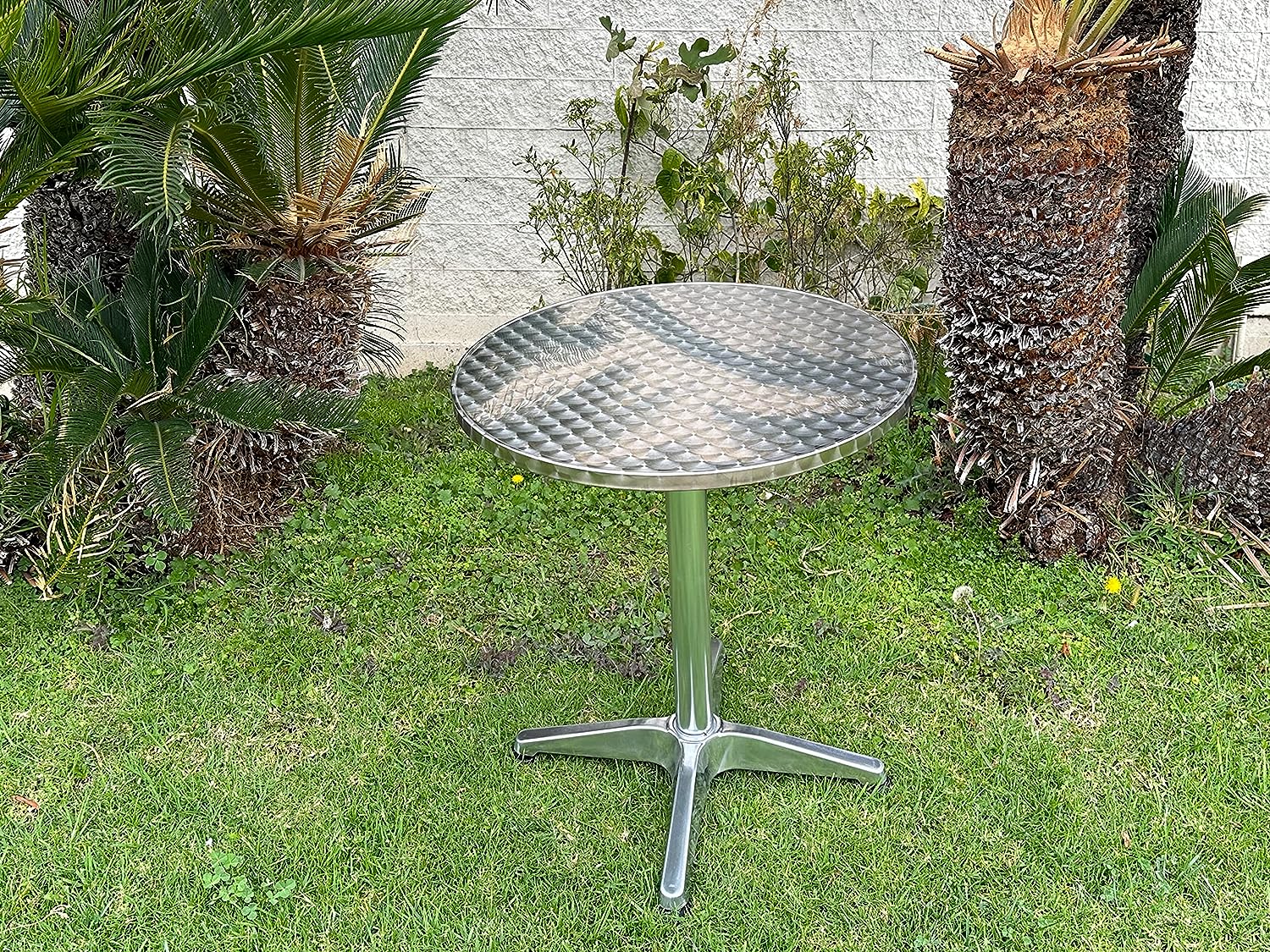 Table Material Metallic (likely aluminum or stainless steel), textured (diamond – plate) top, smooth reflective metal base (starburst design)