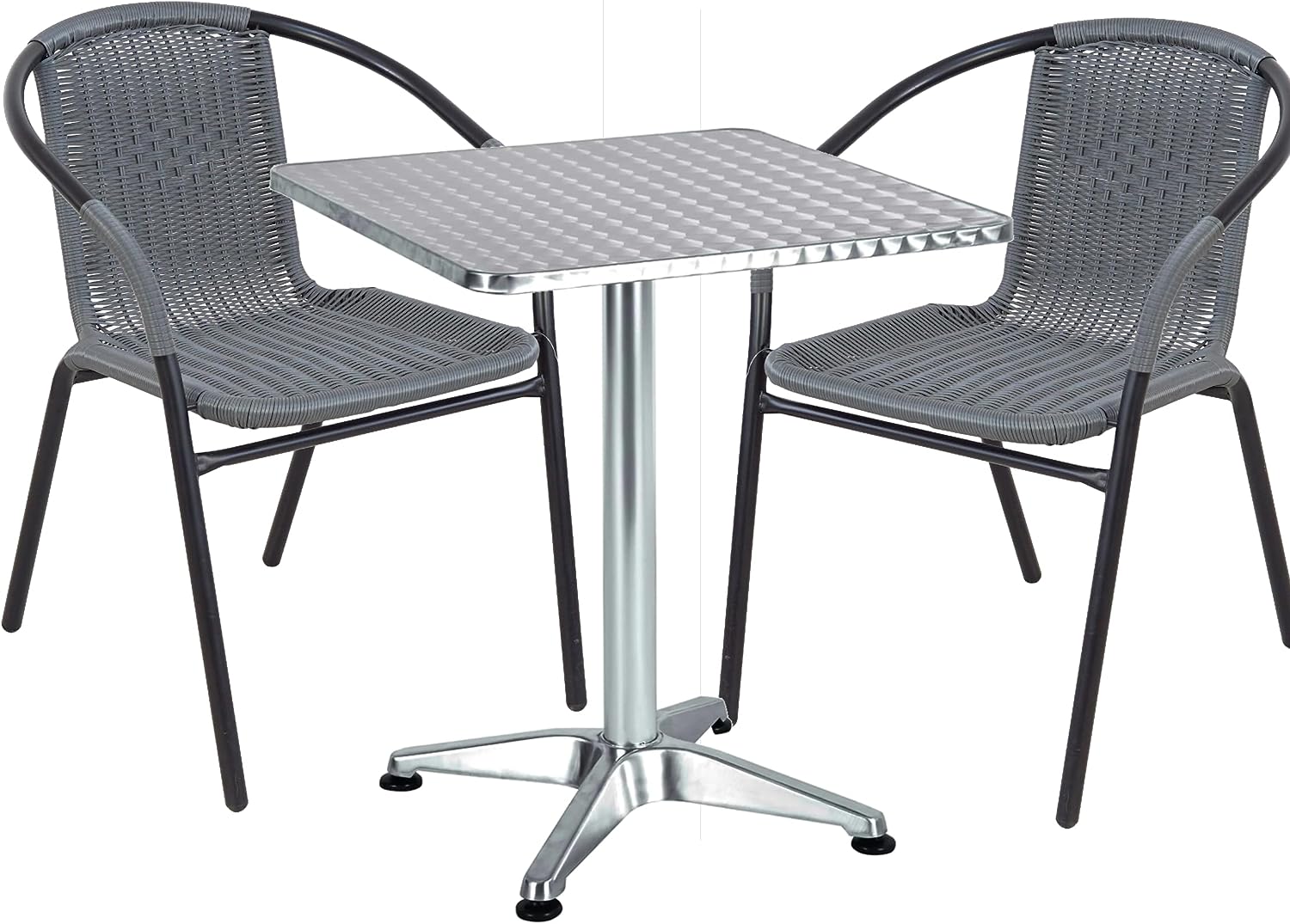 - Both chairs and table are weather – resistant, with the chairs having UV and water – resistant woven material and powder – coated metal frames, and the table having a durable diamond – plate tabletop.