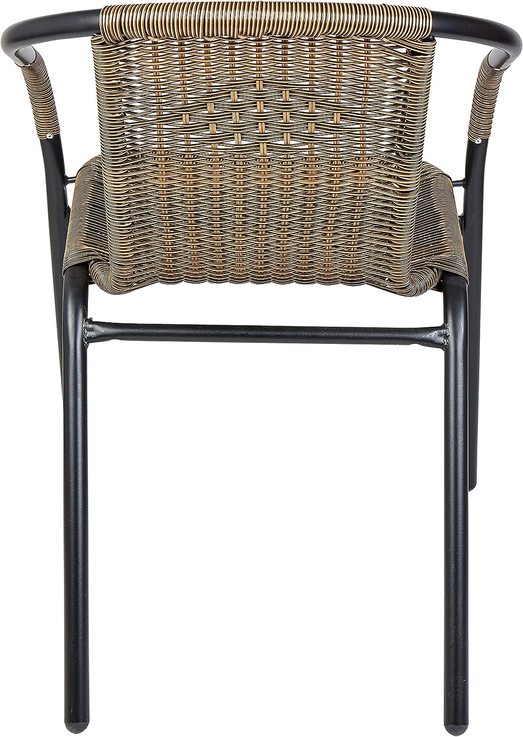 | Chair Color | Light brown/tan woven synthetic rattan with black metal armrests and frame |