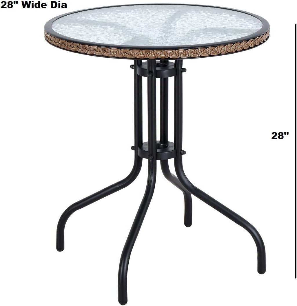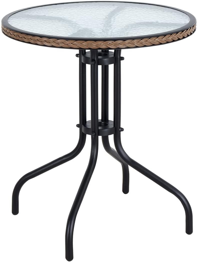 | Table Color | Black metal frame, clear or frosted glass tabletop with subtle pattern, tan/brown woven trim |