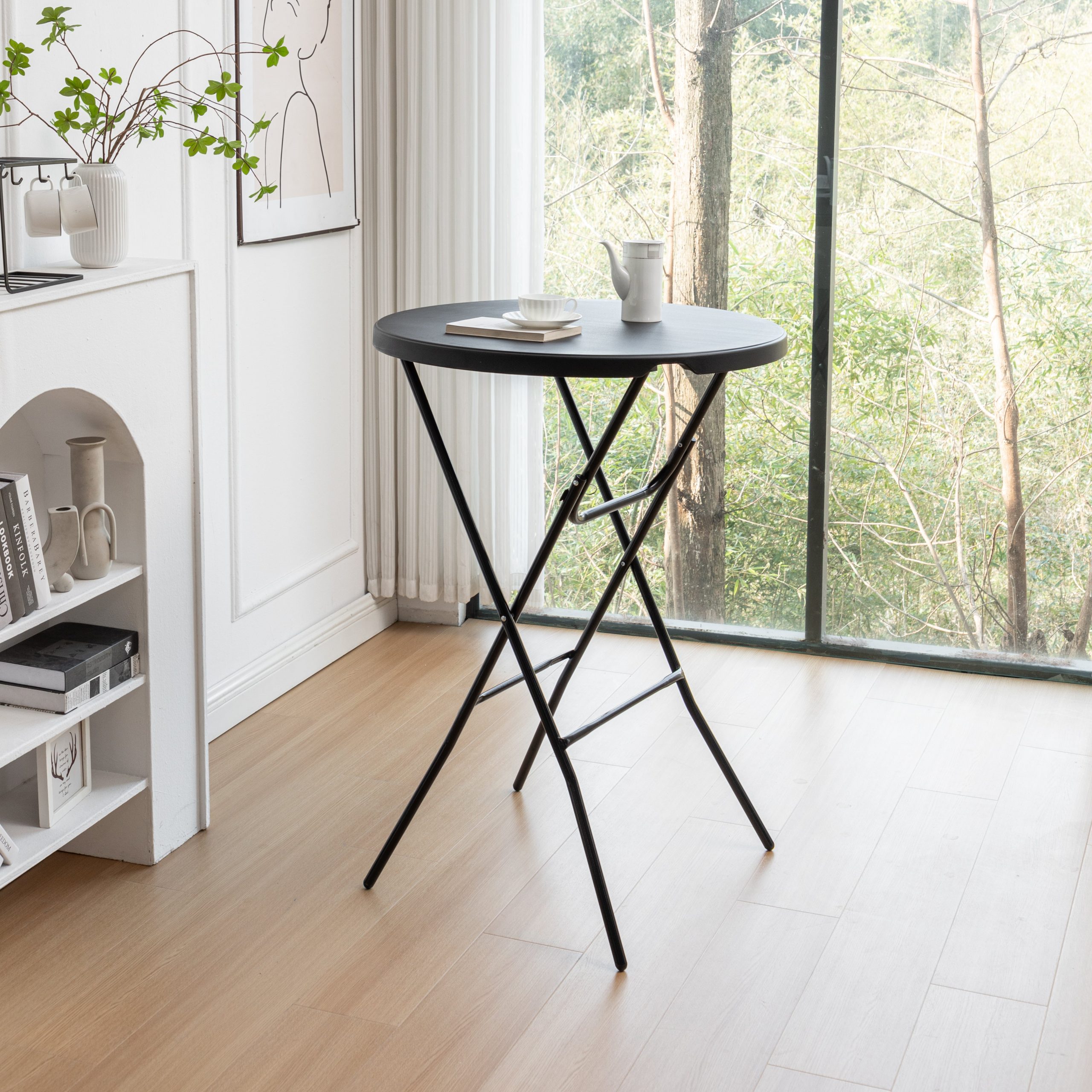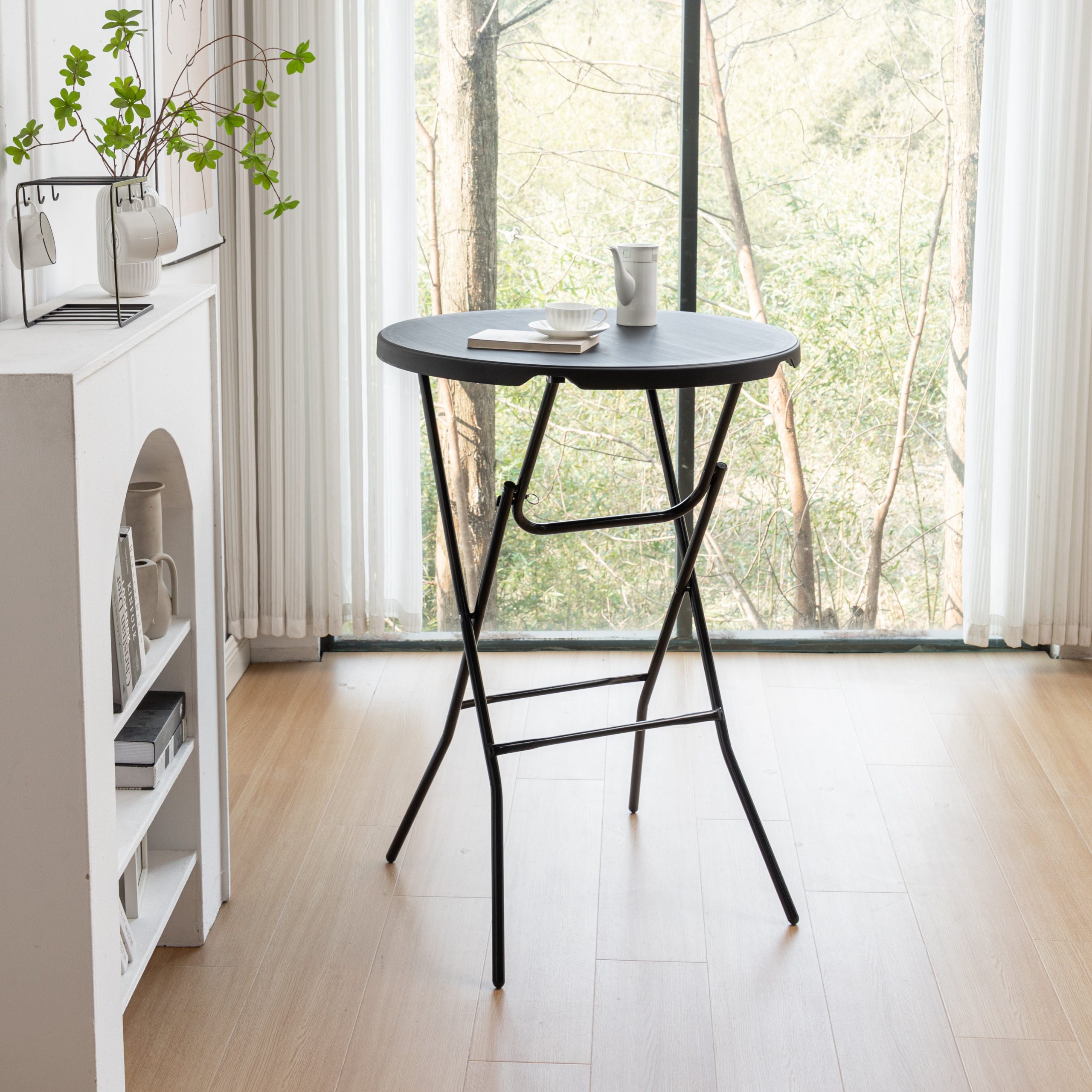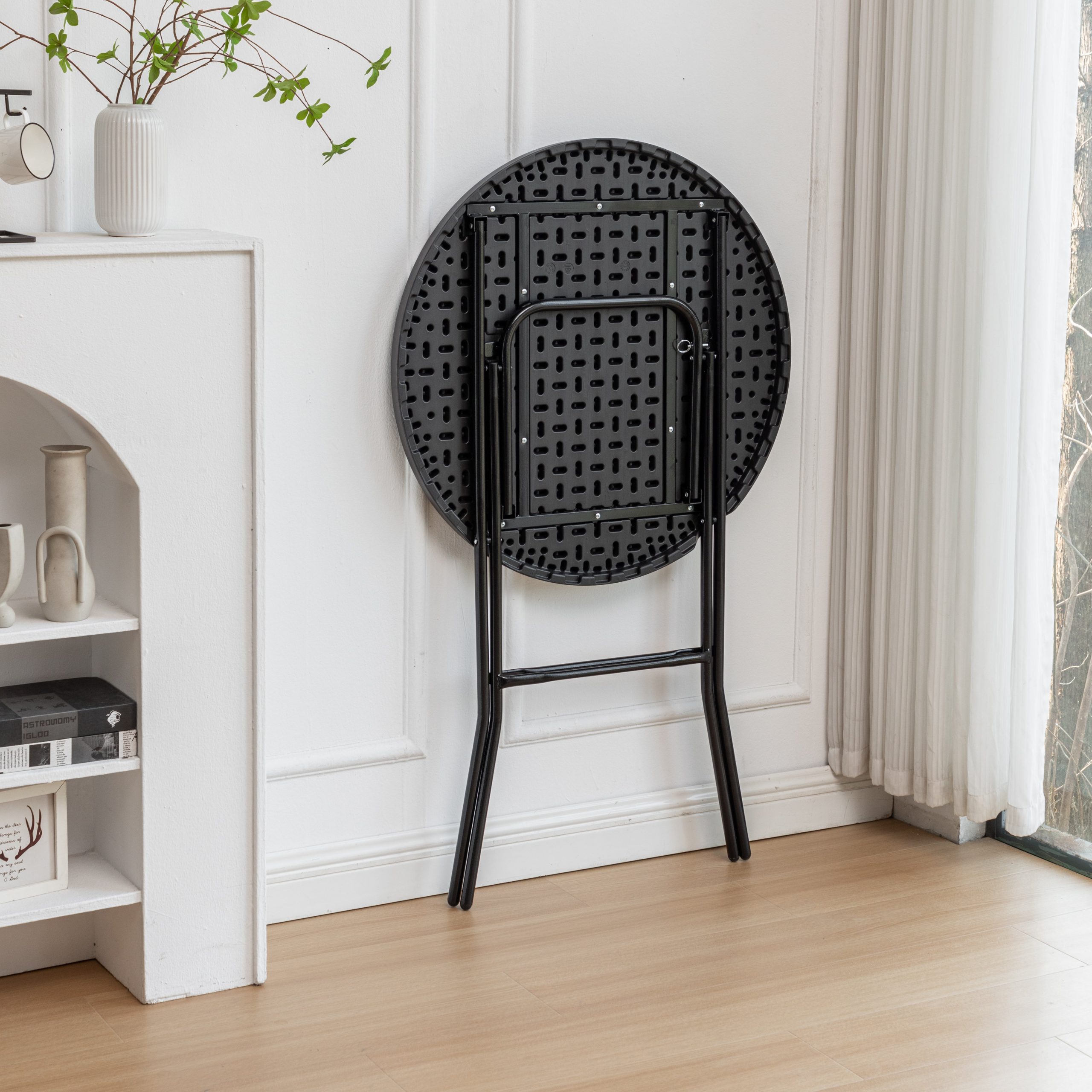 This folding round table is a great addition to any indoor space. Its compact and collapsible design makes it easy to store and transport, while the round tabletop provides a stylish and functional surface.