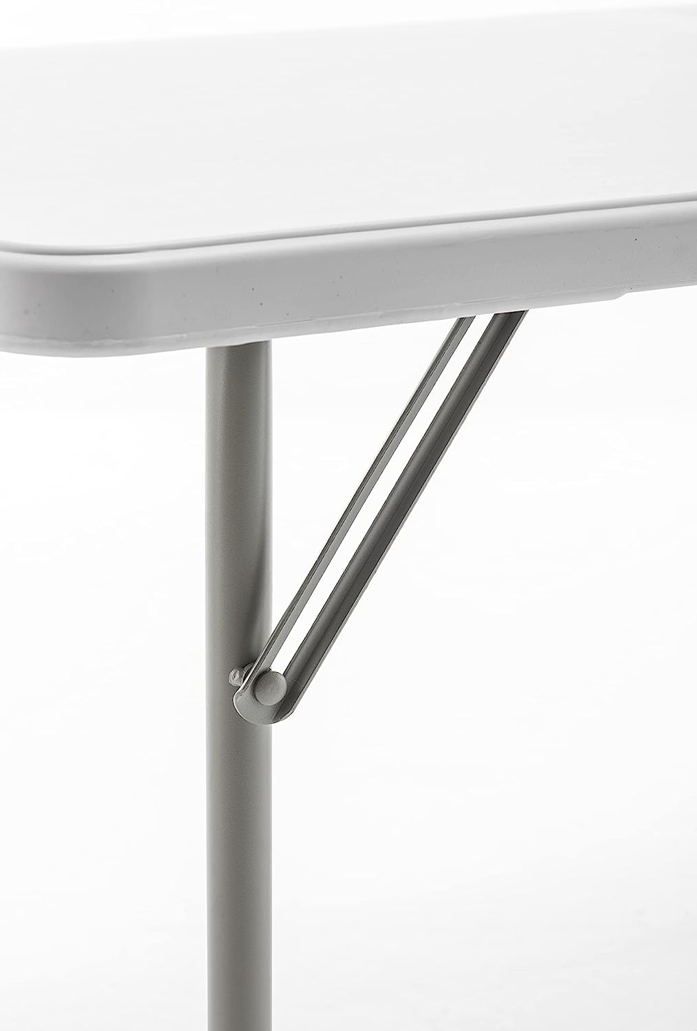 Design Elements Clean, minimalist lines, rounded edges on the tabletop, metal frame with horizontal bracing bars, smooth, matte metal struts for folding mechanism