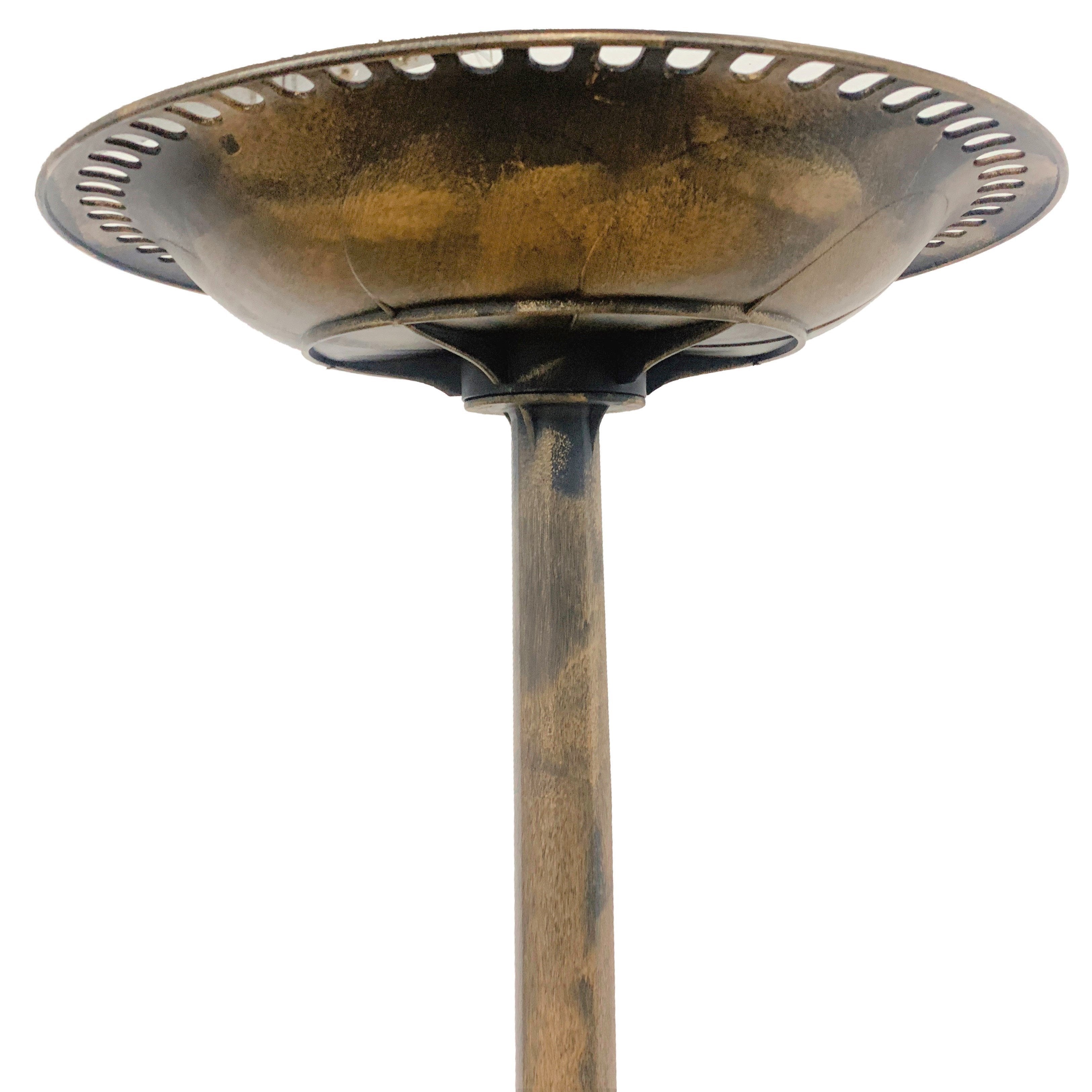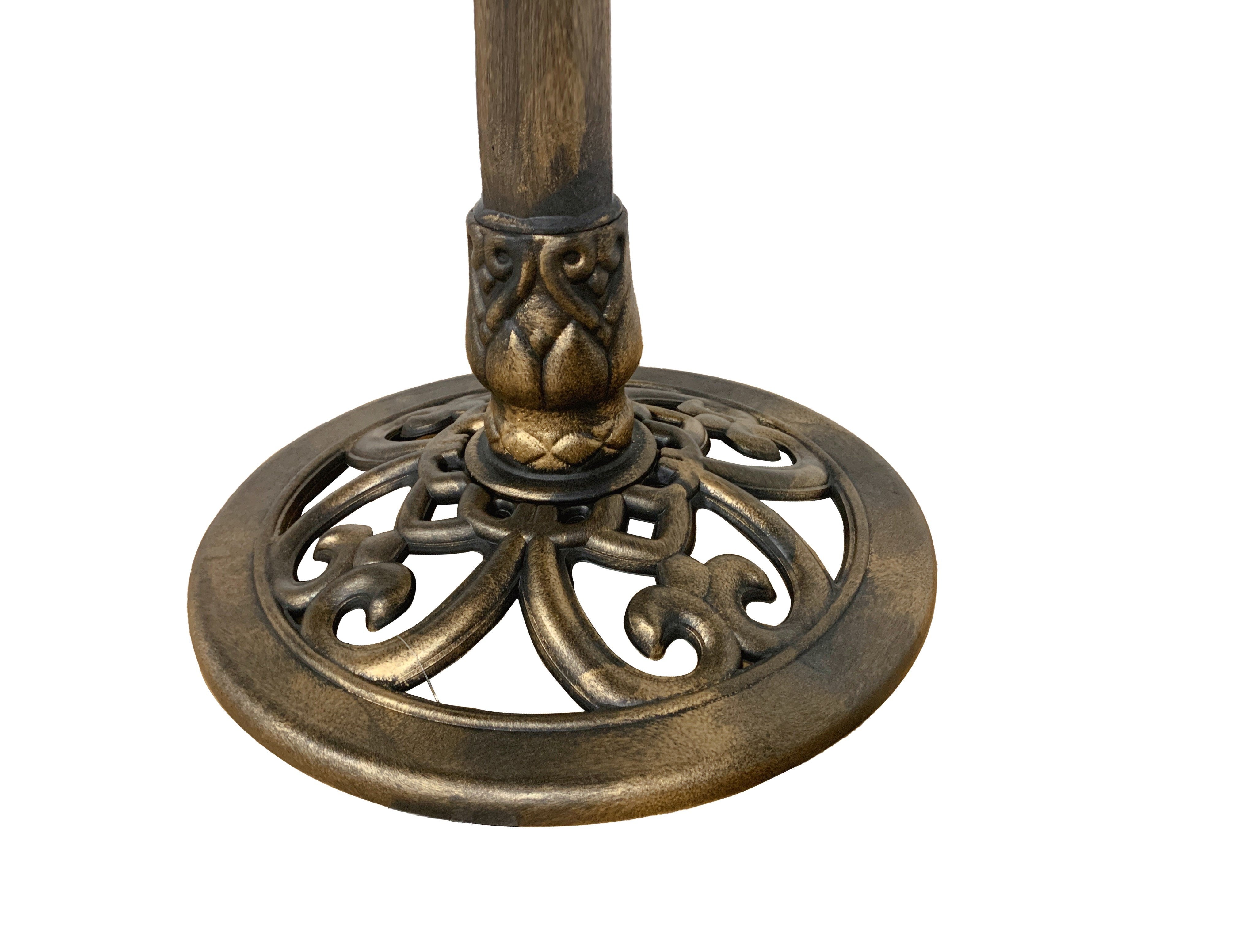 | Base Design | Circular, ornate metal base with openwork filigree featuring swirling loops, curves, and floral motifs, wide flat outer edge, and central decorative ‘bud’ element |