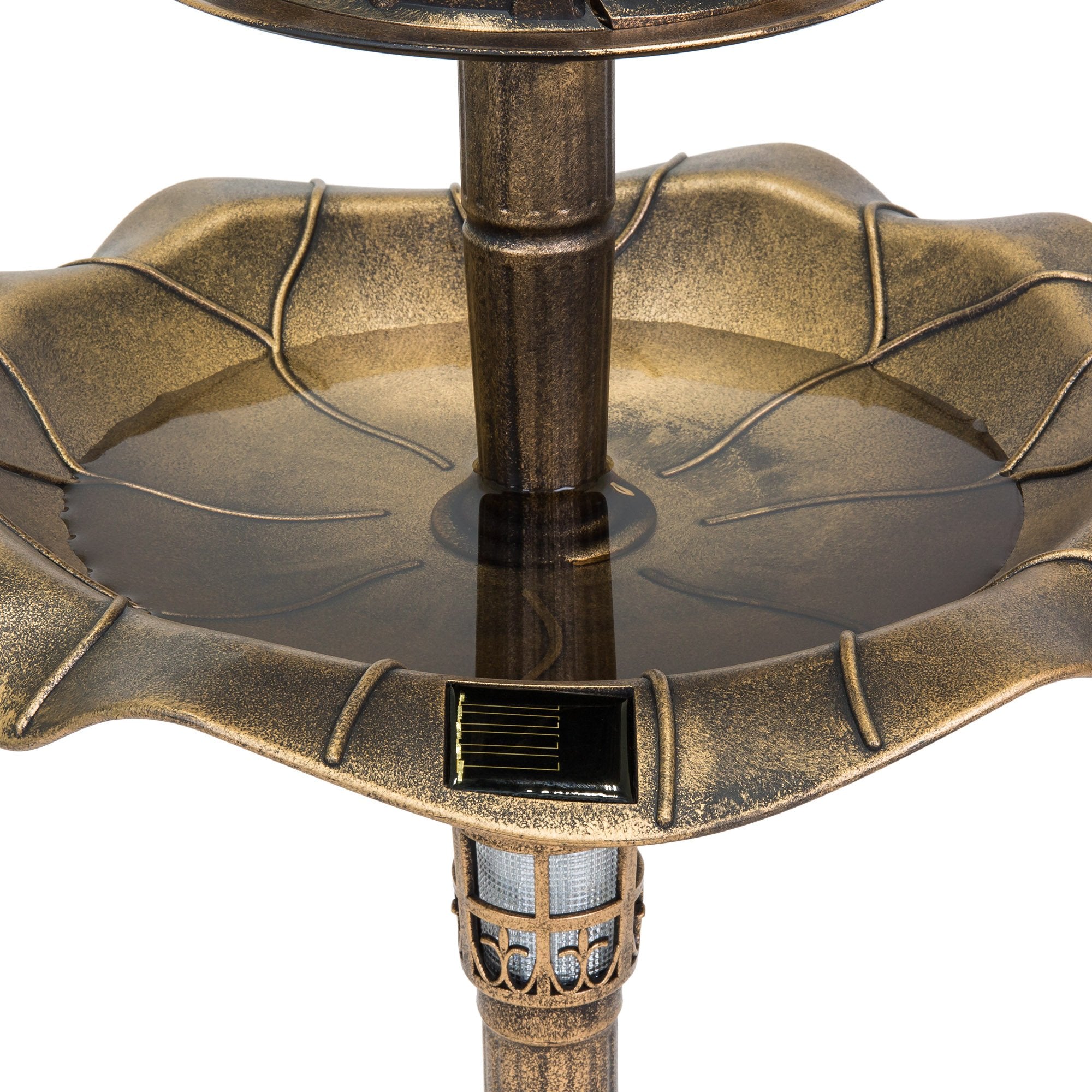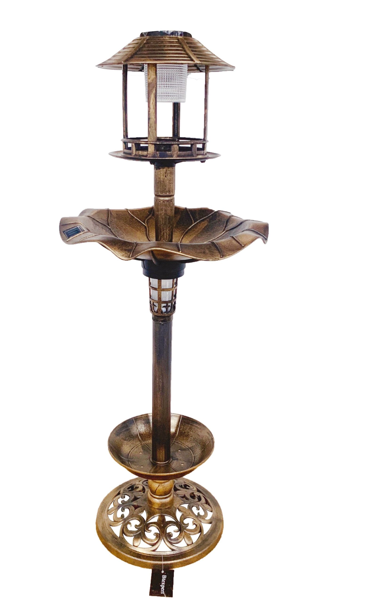 | Color & Design | Primary Color: Warm, aged bronze/antique gold with dark brown/black accents; Patterns/Details: Leaf – shaped basin with raised veins, pagoda – style lantern roof with horizontal slats, ornate filigree base; Visual Elements: Transparent or frosted central light, circular upper tray, vertical supports |