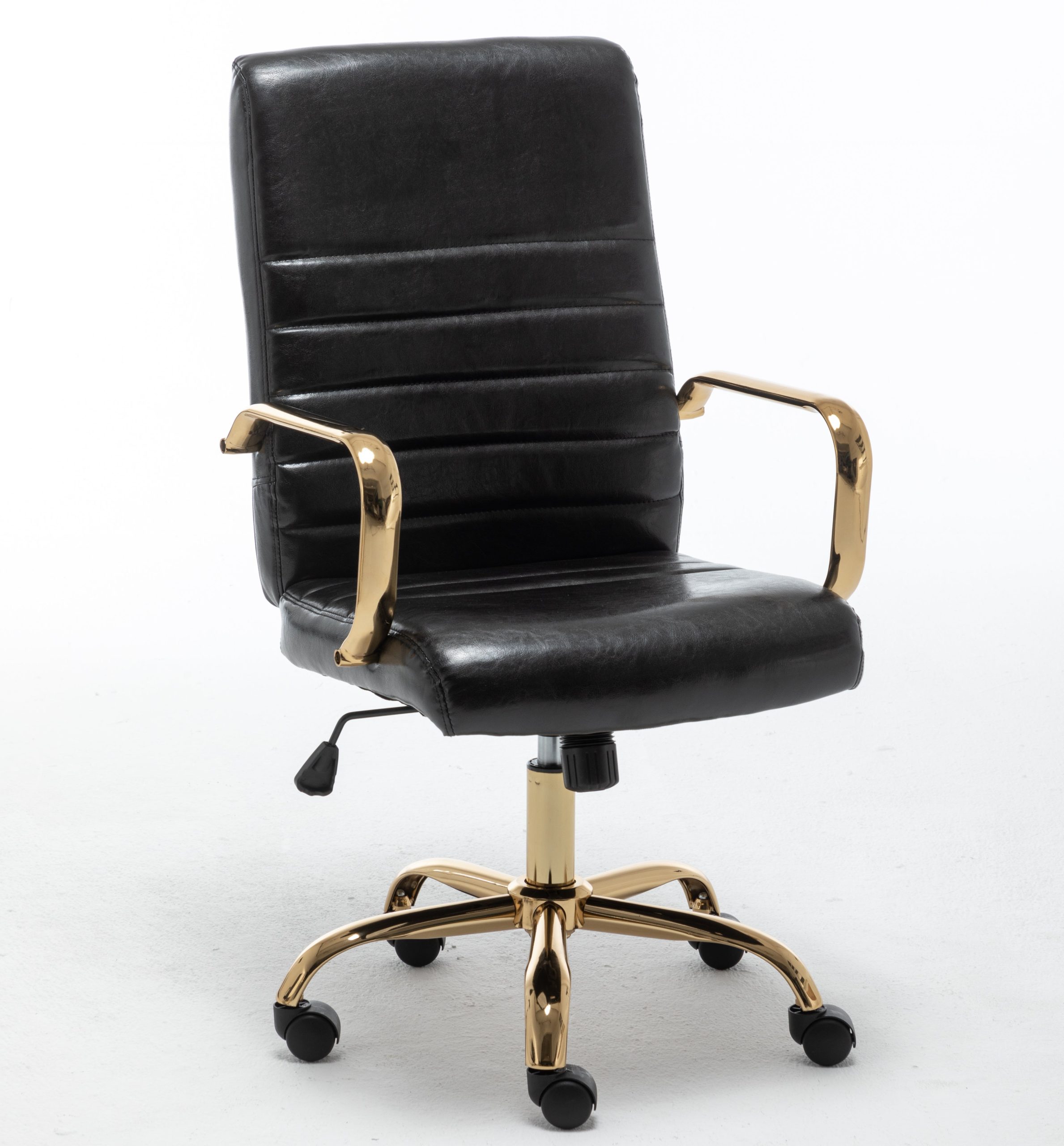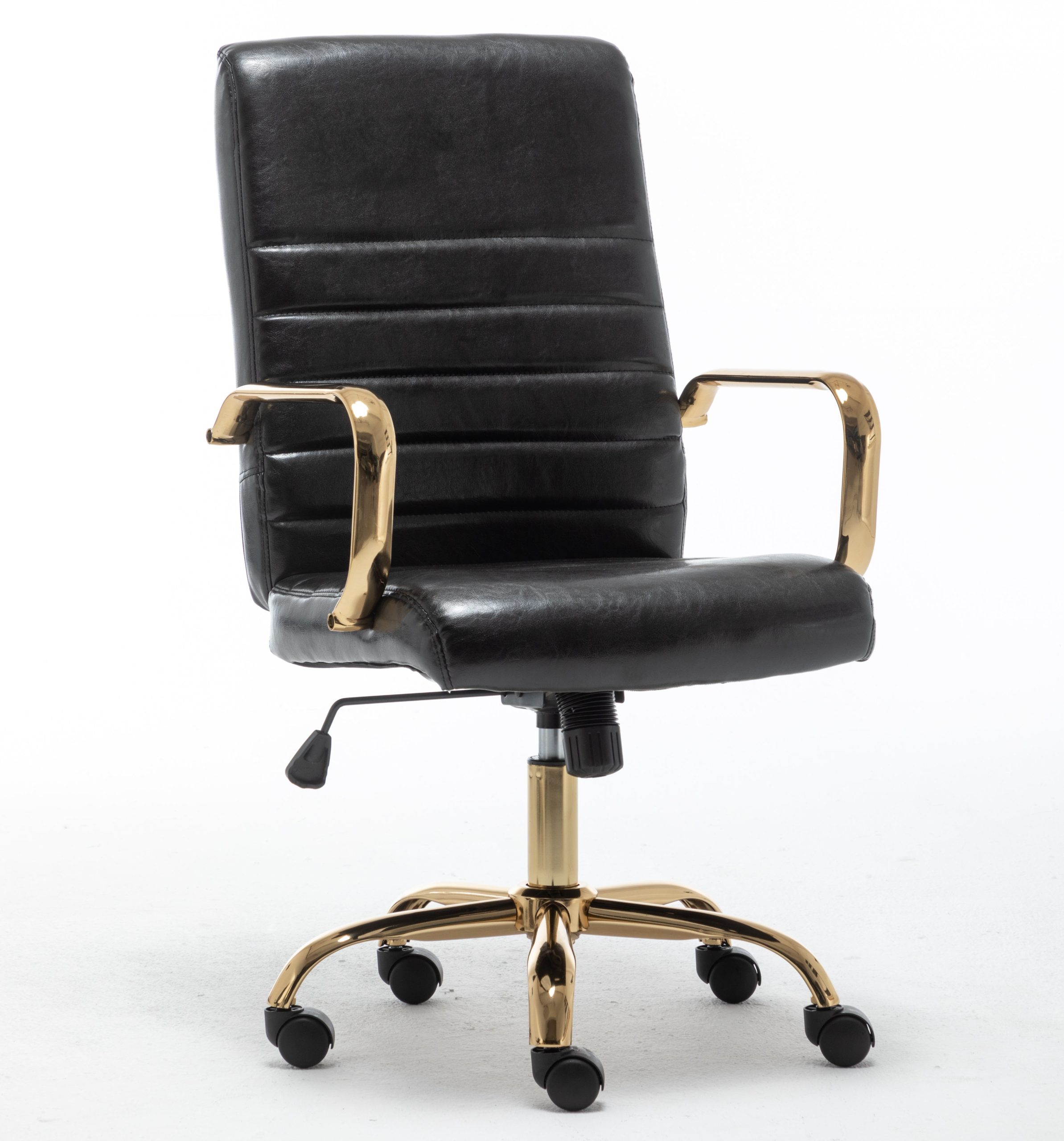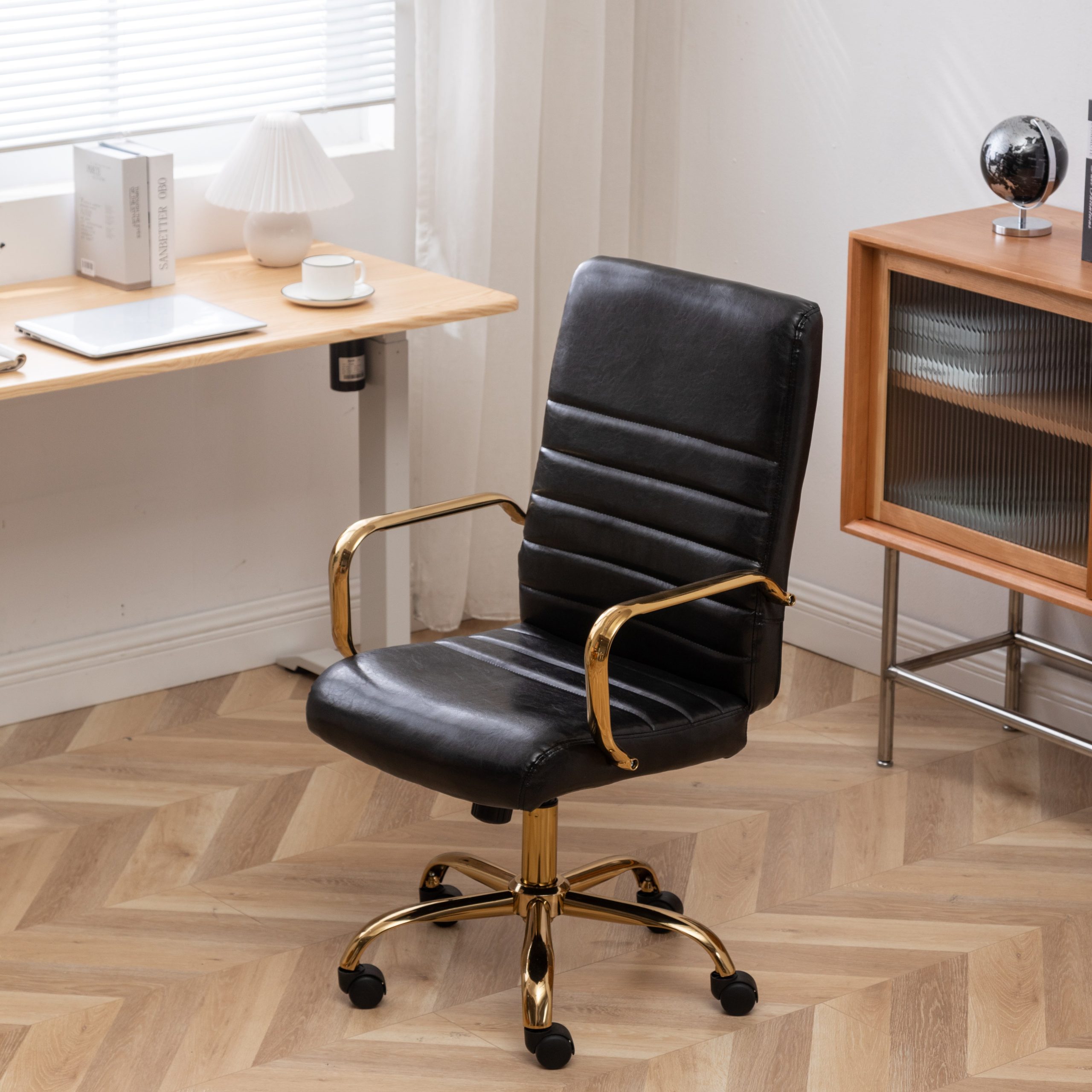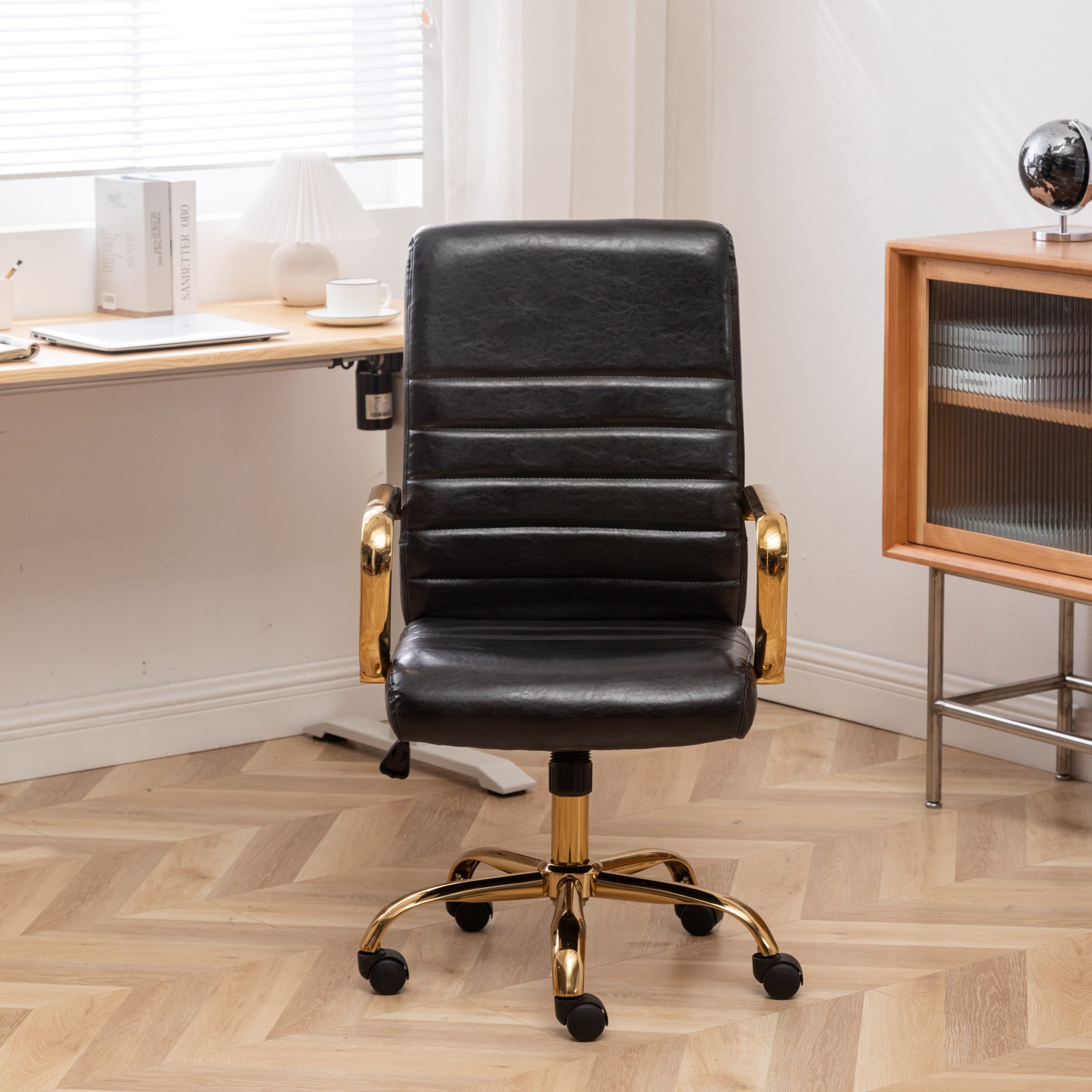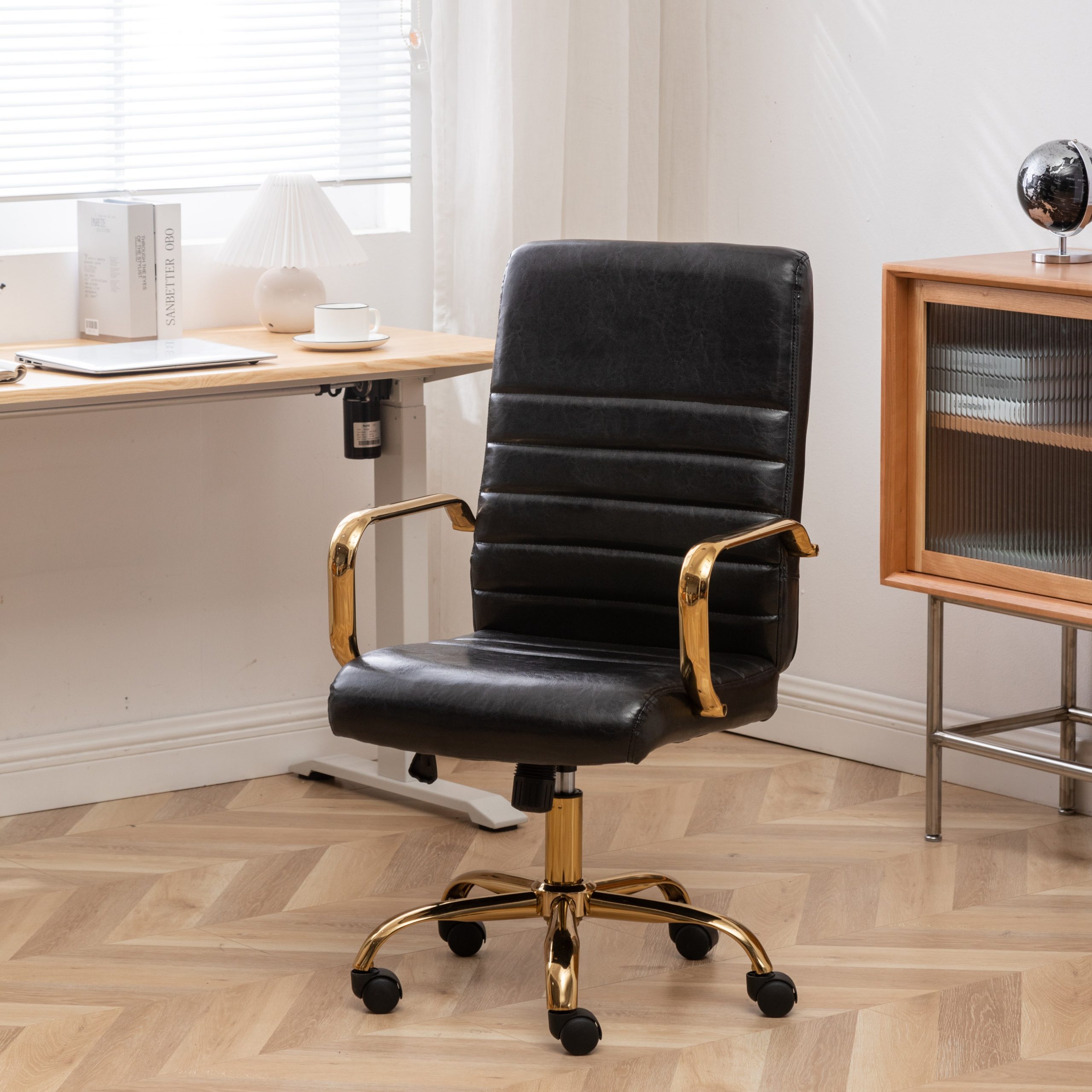This adjustable office chair is designed for those long hours of work or study. It combines style with functionality, offering a comfortable seating experience. The sleek black and gold color scheme adds a touch of luxury to any workspace.