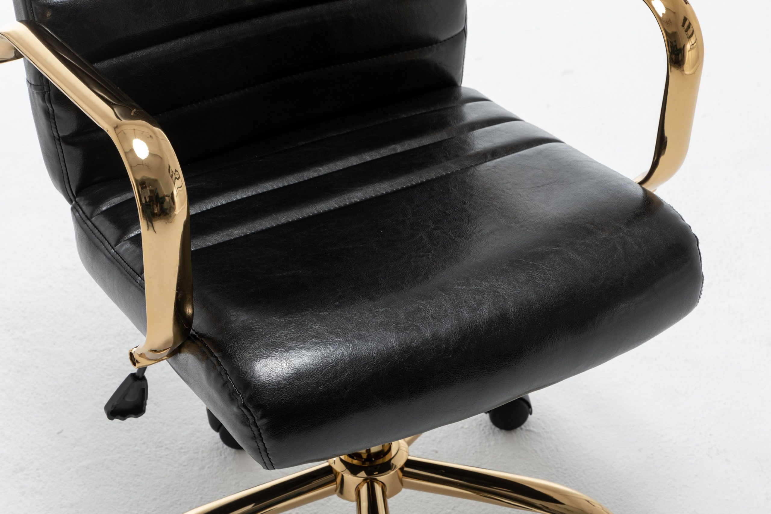 | Design Elements | Horizontal stitched lines on seat and backrest, curved ergonomic armrests, five – star metal base with black wheels |