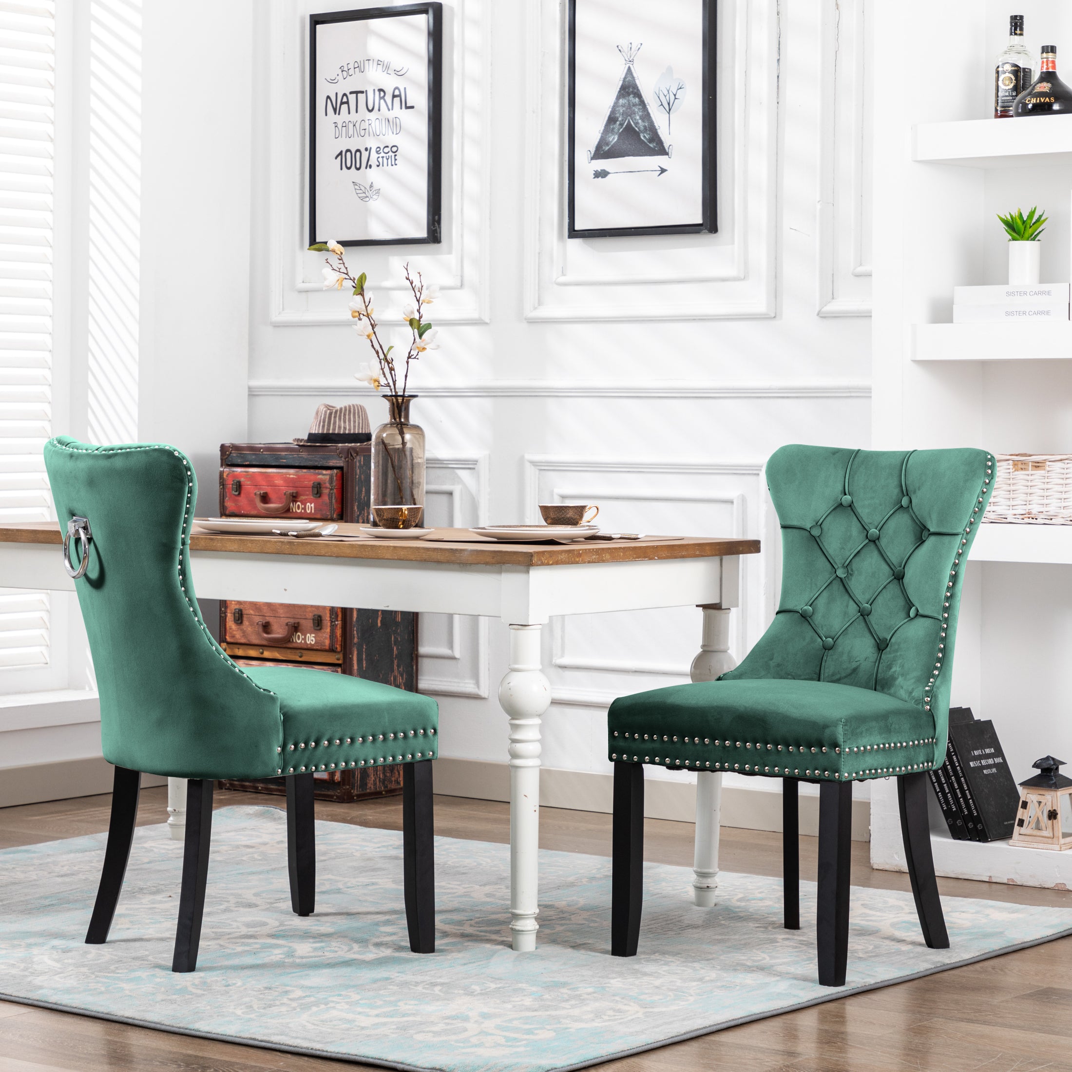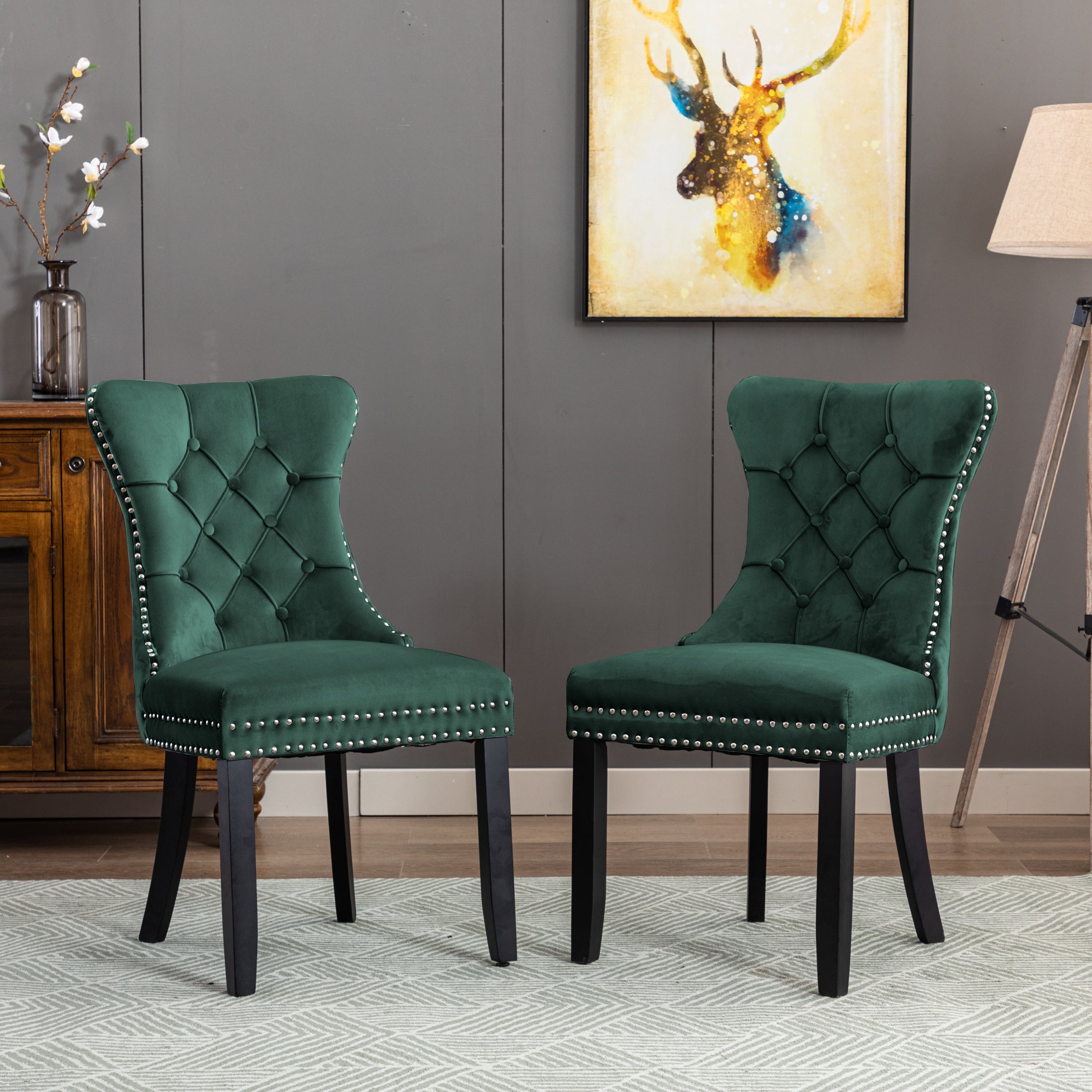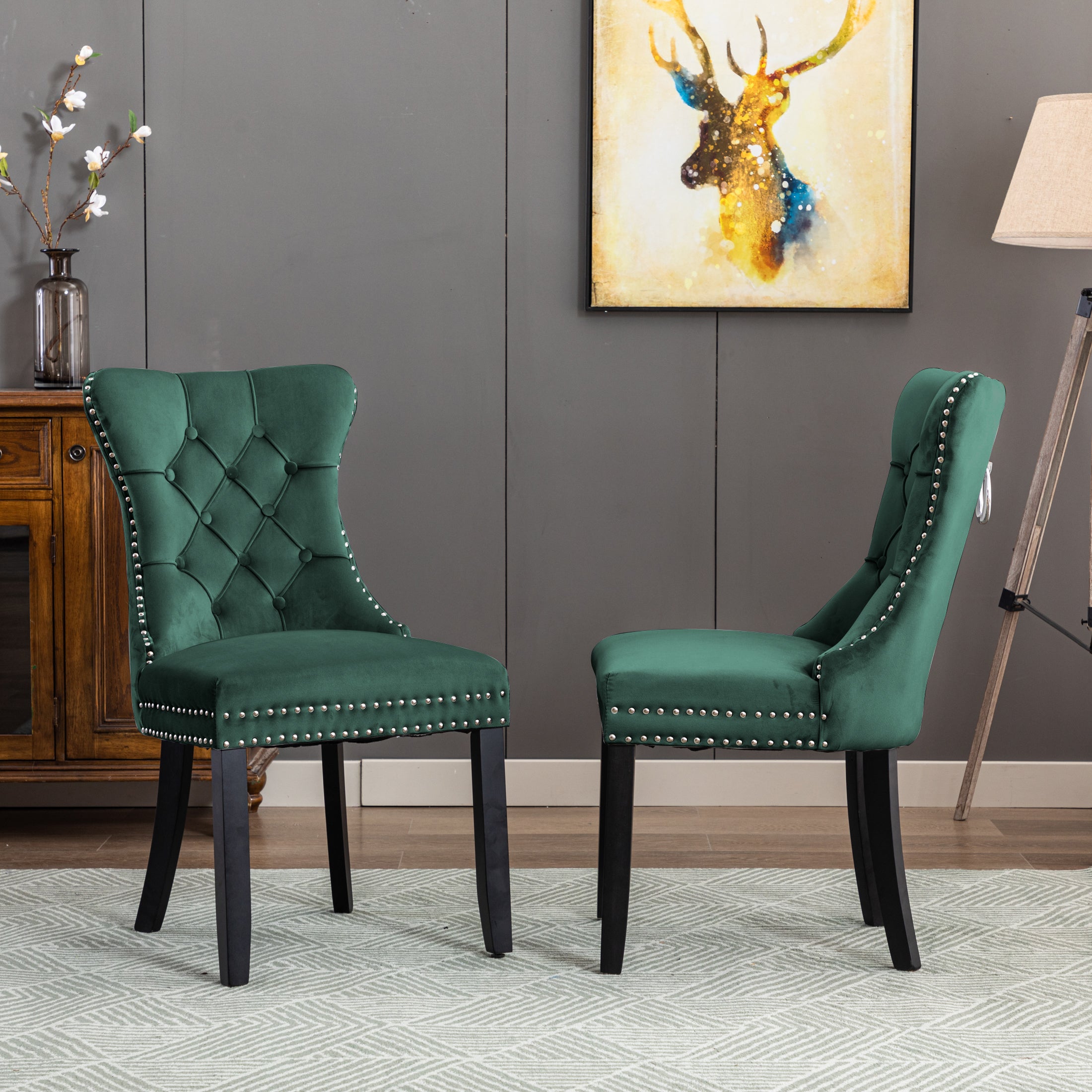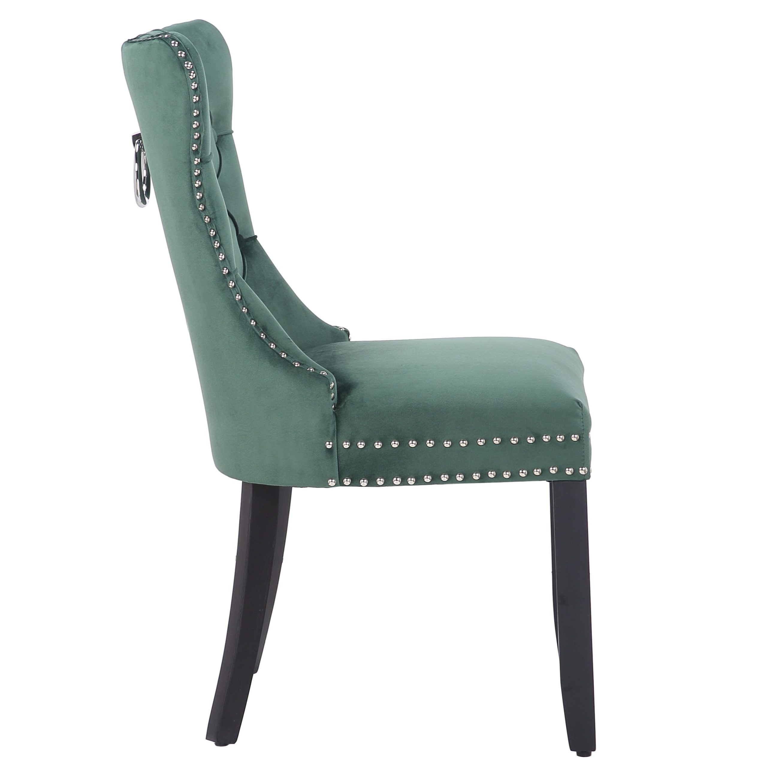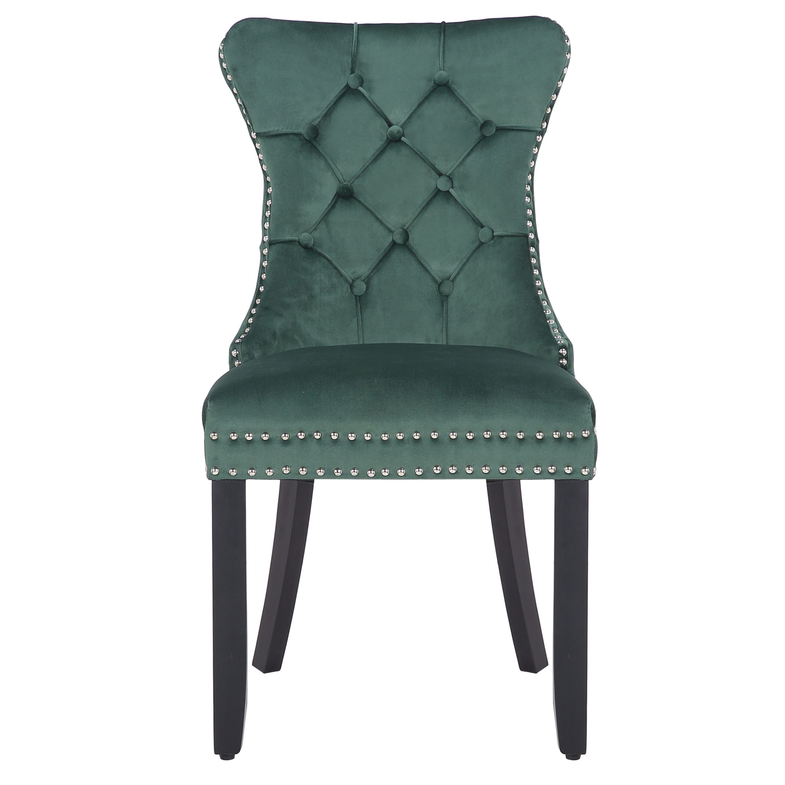 This is an upholstered dining chair that can also serve as an accent chair. With its luxurious deep – green velvety fabric and classic design elements, it brings both style and comfort to interior spaces.