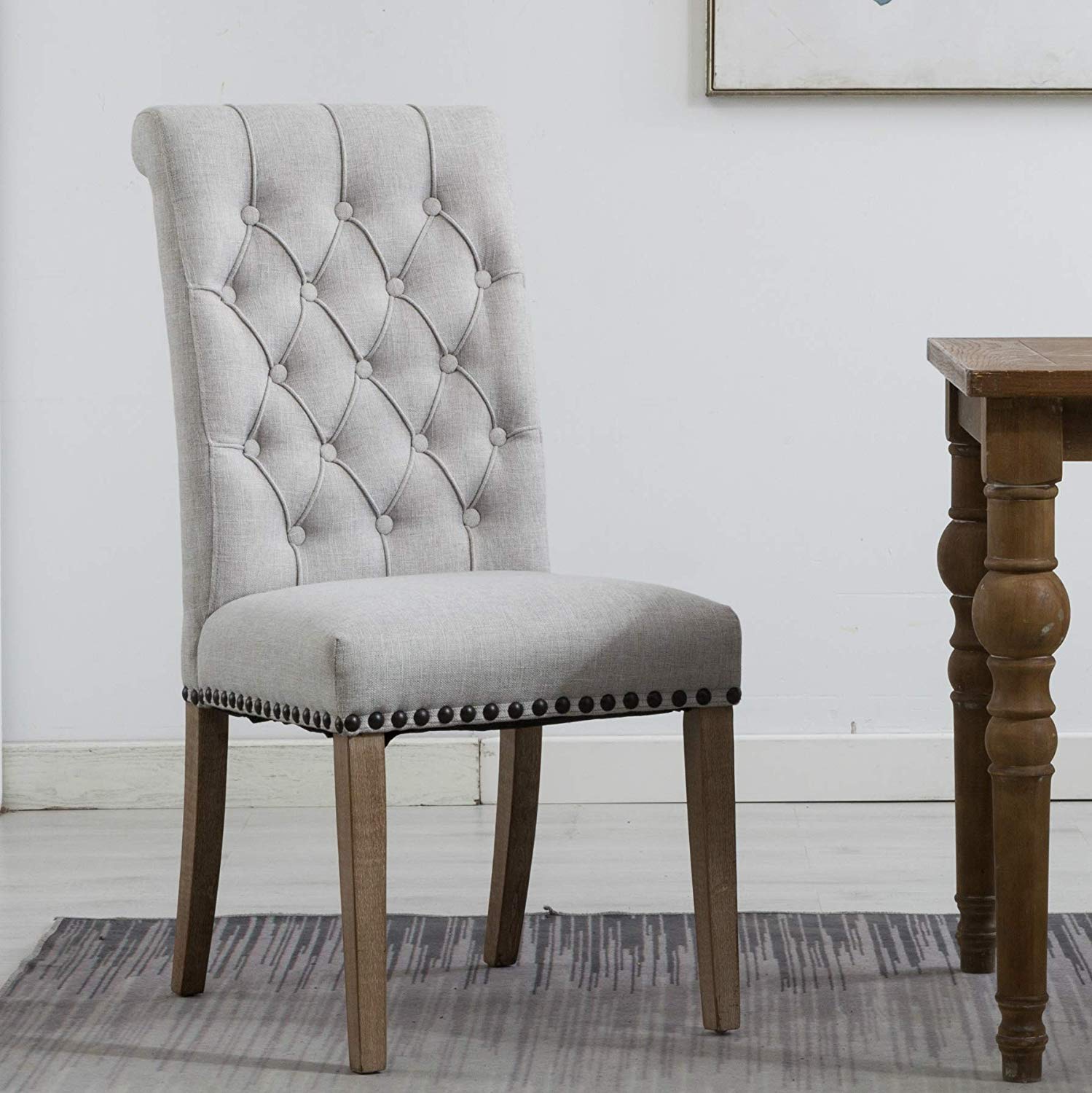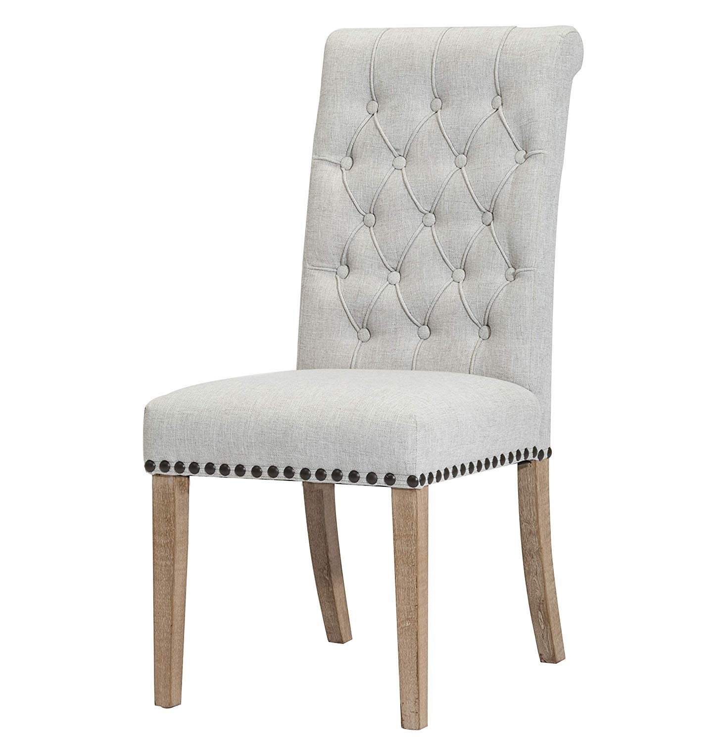 - Materials: Gray linen upholstery and distressed washed oak wood legs.