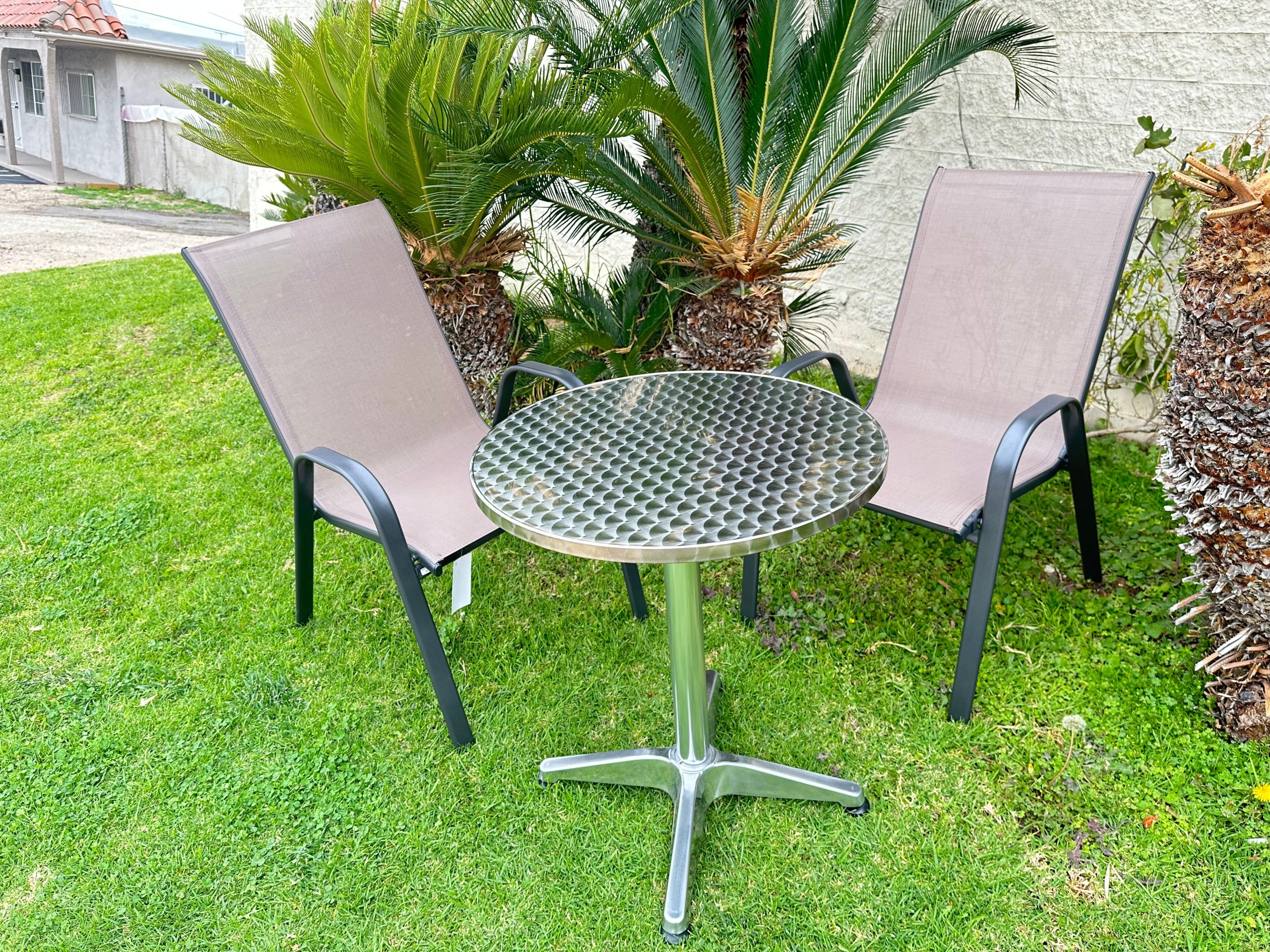 | Colors | Dark gray/black (chair frame), light brown/tan (chair mesh), silver/metallic (table top and base) |