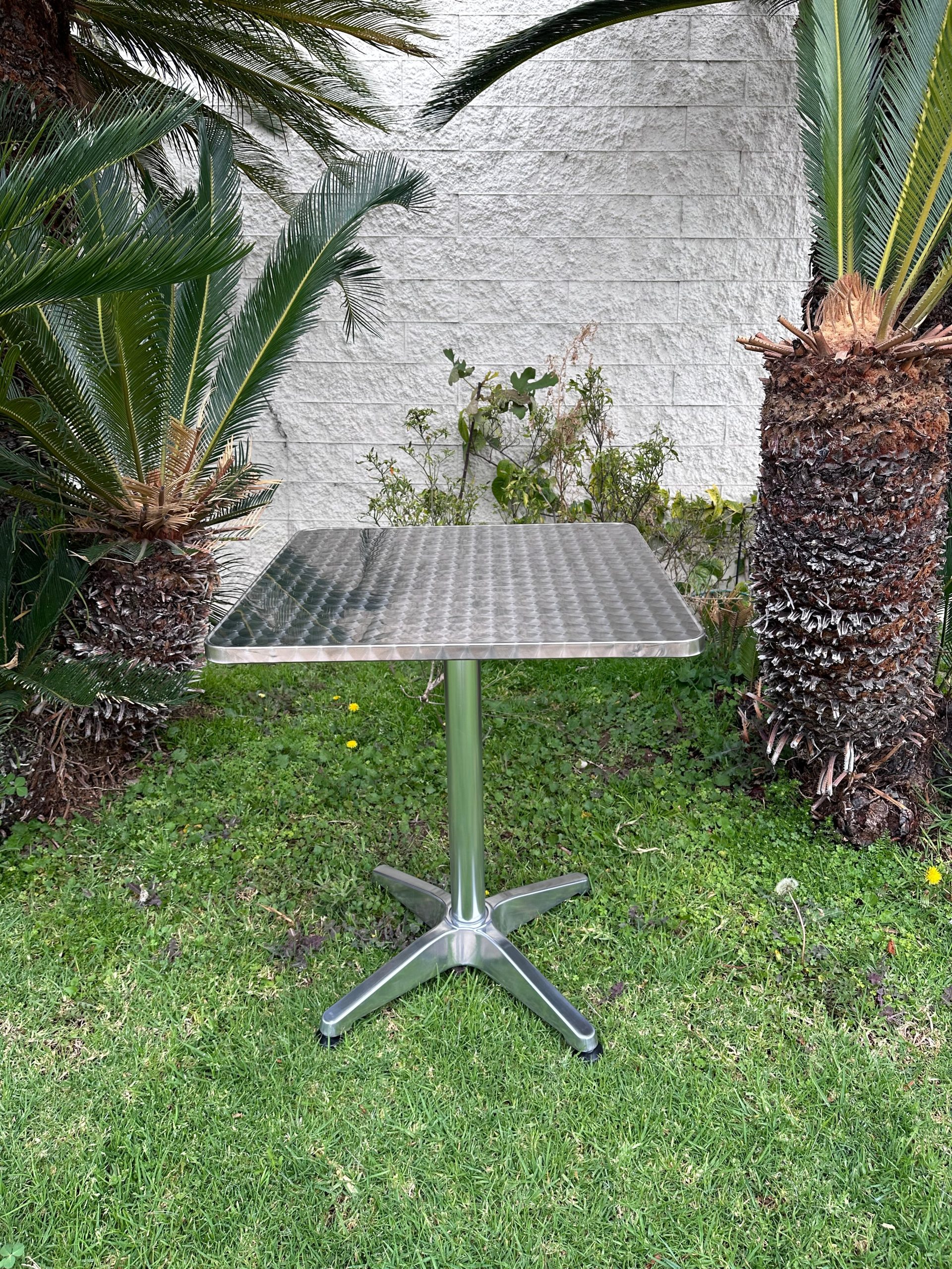 This outdoor square patio table is designed for small gatherings or individual use. It features a modern geometric design and is built to withstand various outdoor conditions. Its durable construction makes it suitable for a variety of outdoor settings.