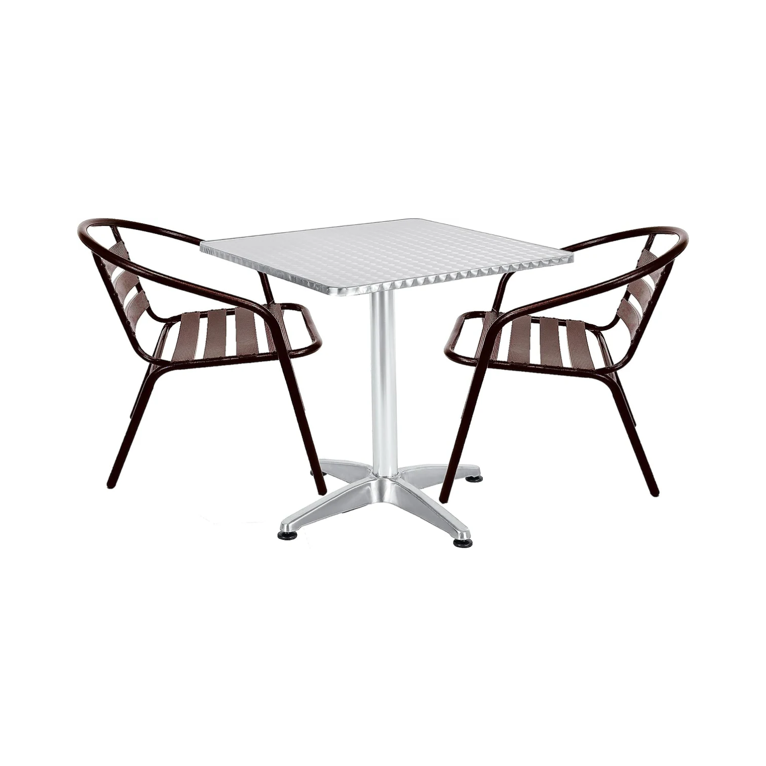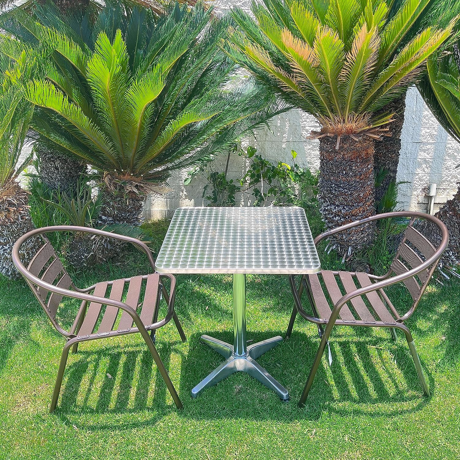 Quality Construction: Solid, welded metal connections (base – to – table and chair frames); Finish: Polished metal surfaces on the table and smooth, even powder coating on chairs to resist rust and weathering.