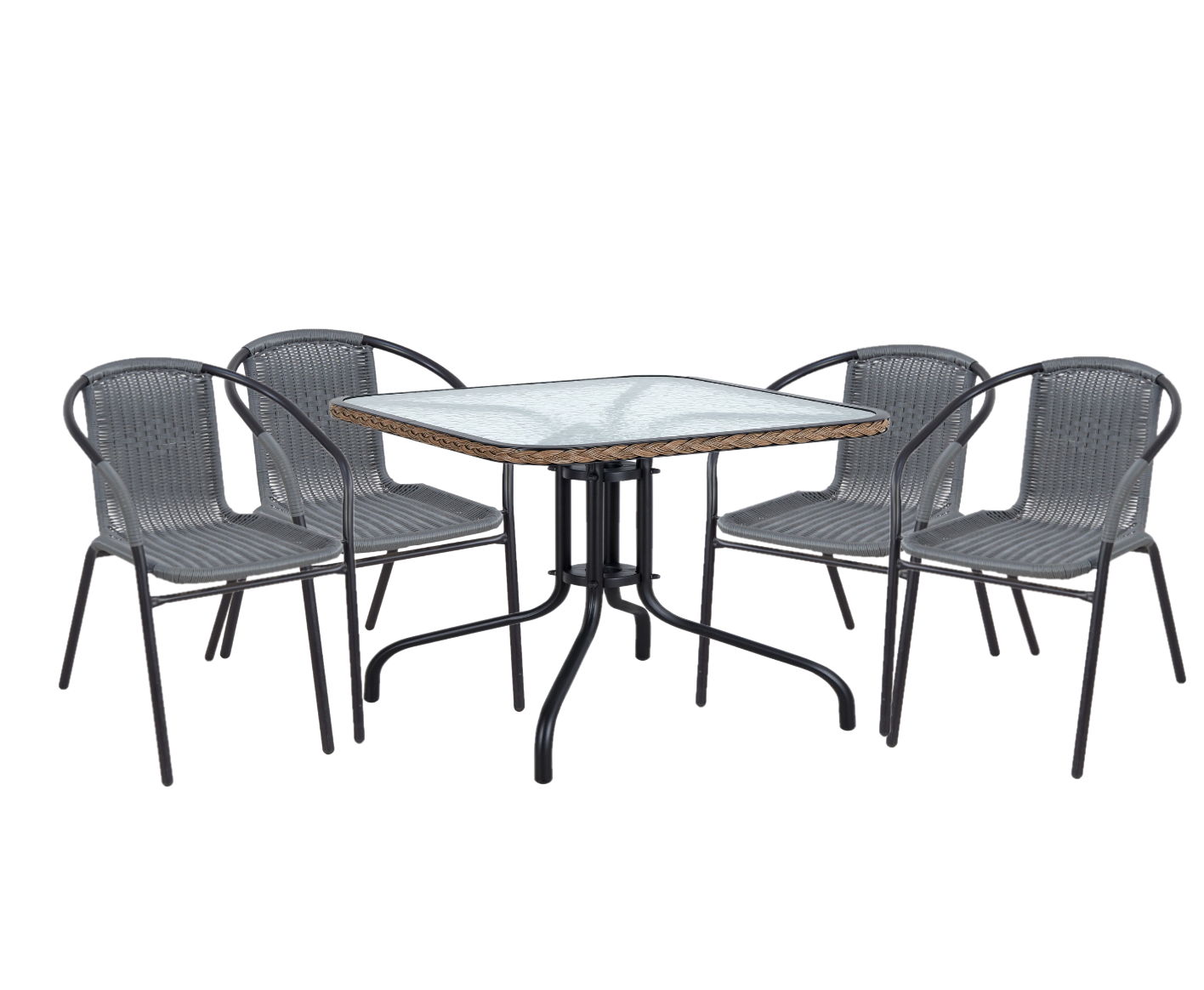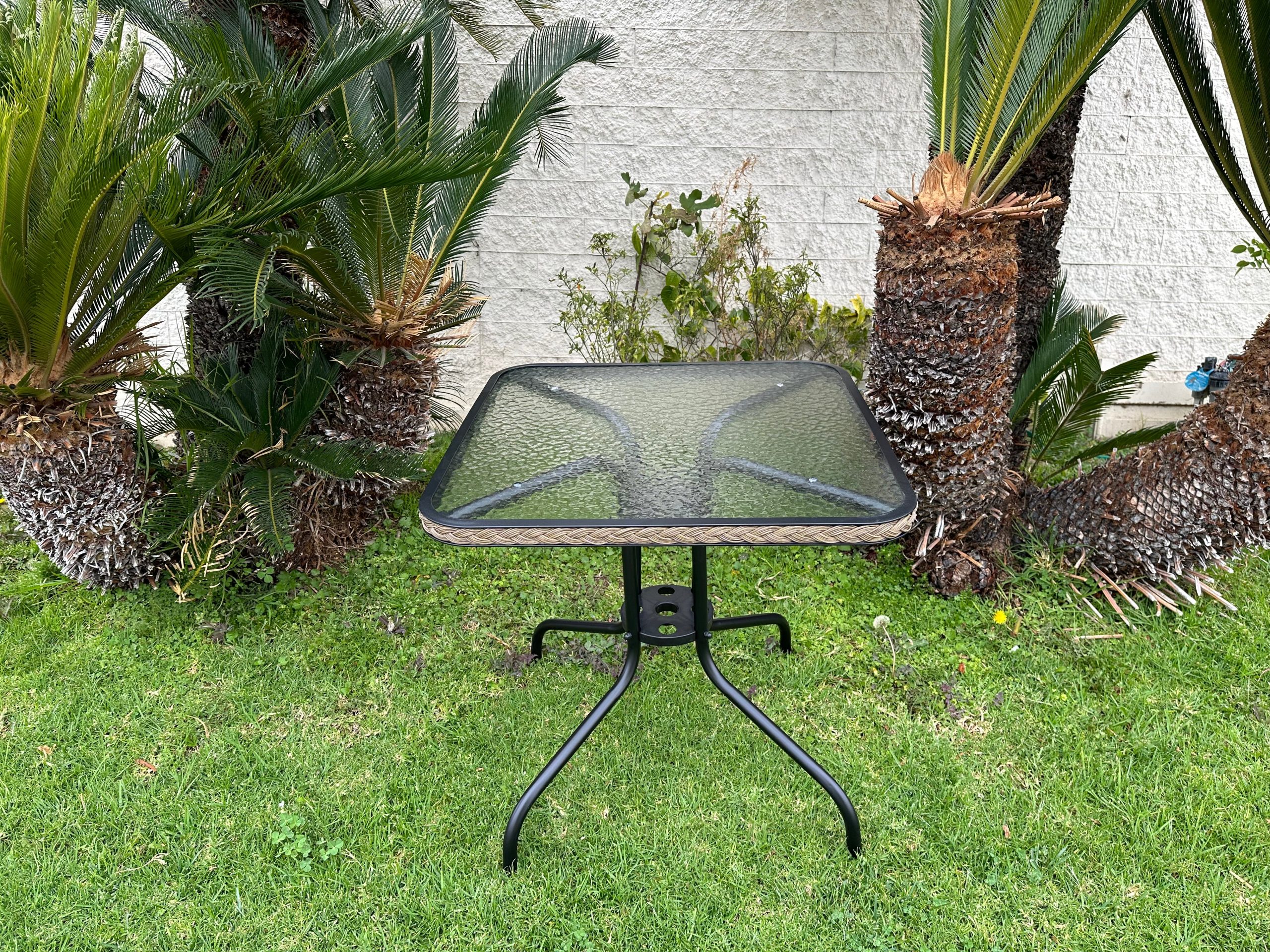 • The table has a textured glass tabletop for slip resistance and easy cleaning, along with woven edging for decorative appeal and weather resistance.