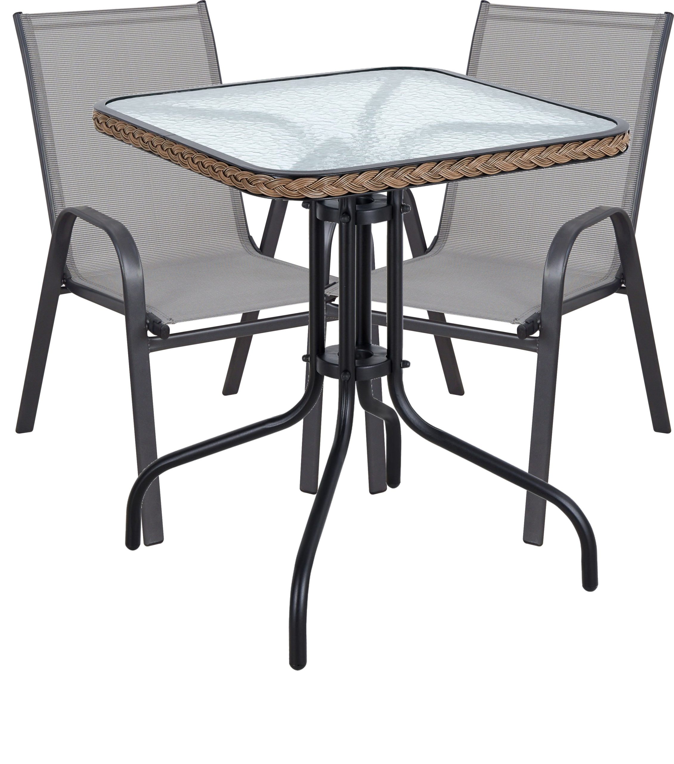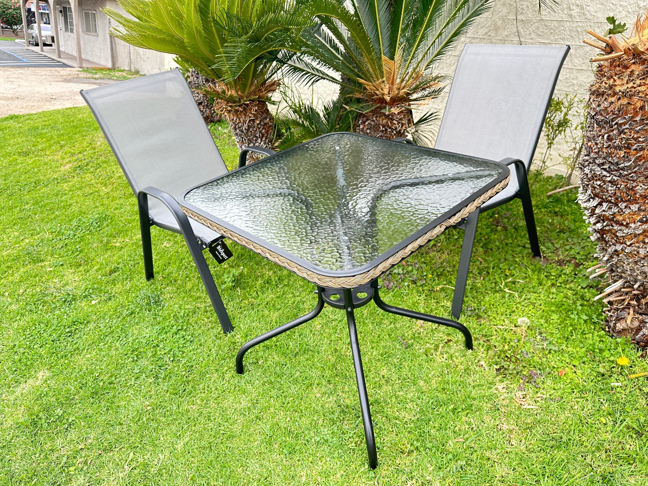 • Regularly clean the glass tabletop with a mild glass cleaner and wipe the metal frames with a damp cloth to prevent rust. Avoid using abrasive cleaners on the mesh fabric of the chairs.
