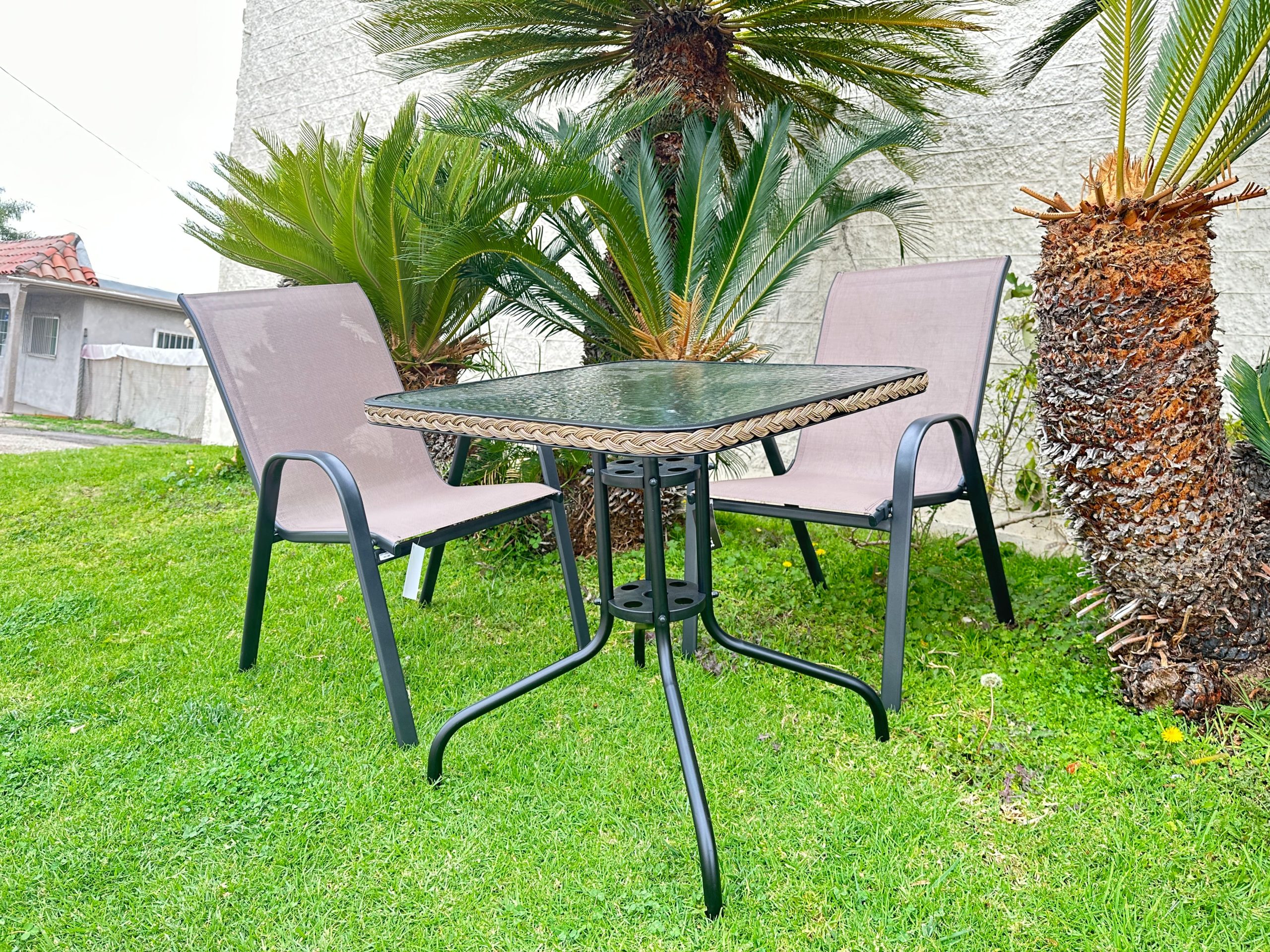 | Table Material | Glass top (textured/hammered finish, tempered), black powder – coated metal frame, woven synthetic trim (natural brown) |