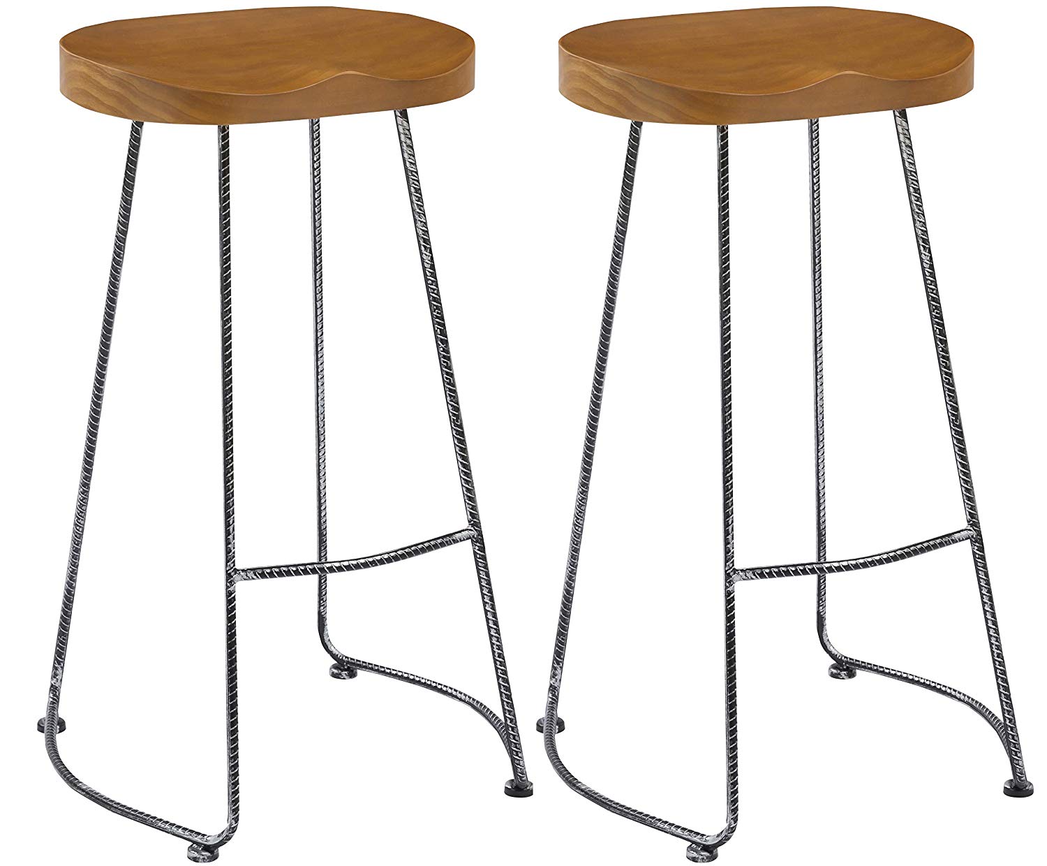 This product is a pair of stylish bar stools, perfect for enhancing the seating arrangement at your bar, kitchen counter, or high table. With a combination of a metal frame and wooden seat, they offer a unique blend of durability and comfort.