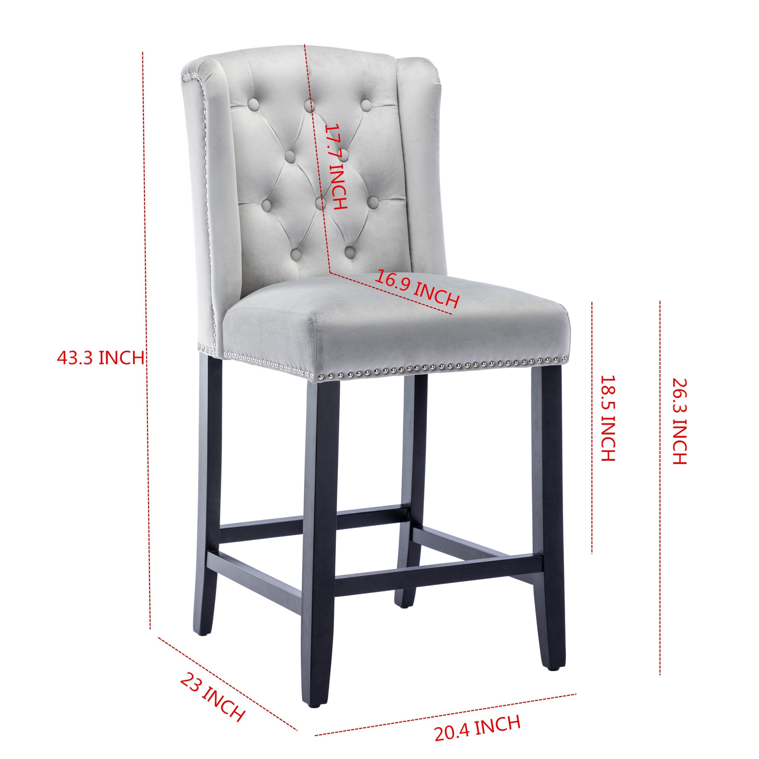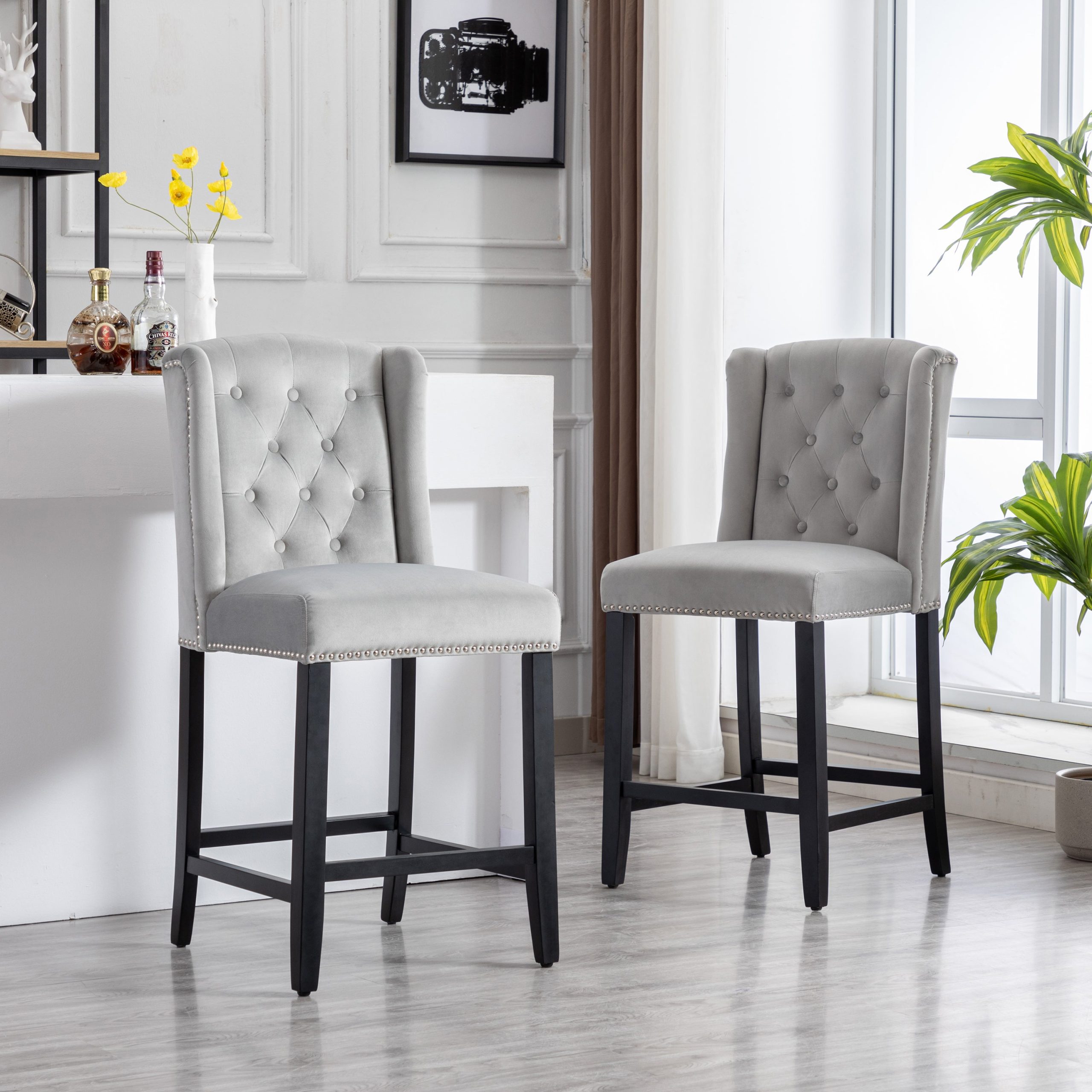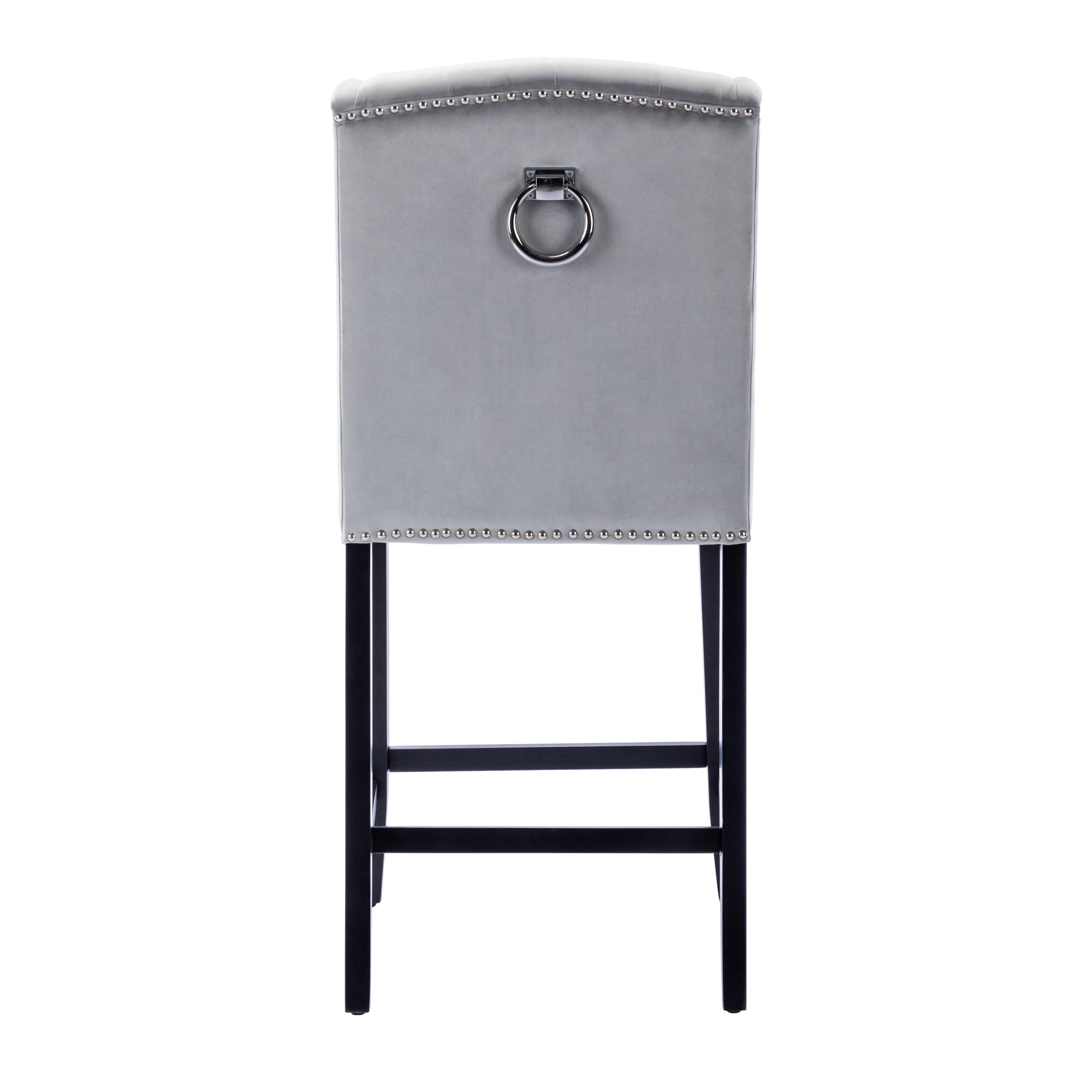 This bar stools set is perfect for elevated surfaces like bars, kitchen islands, and high dining tables. It features a tall backrest and a cushioned seat for a comfortable sitting experience. The combination of light gray upholstery and black frame creates a classic and neutral look.