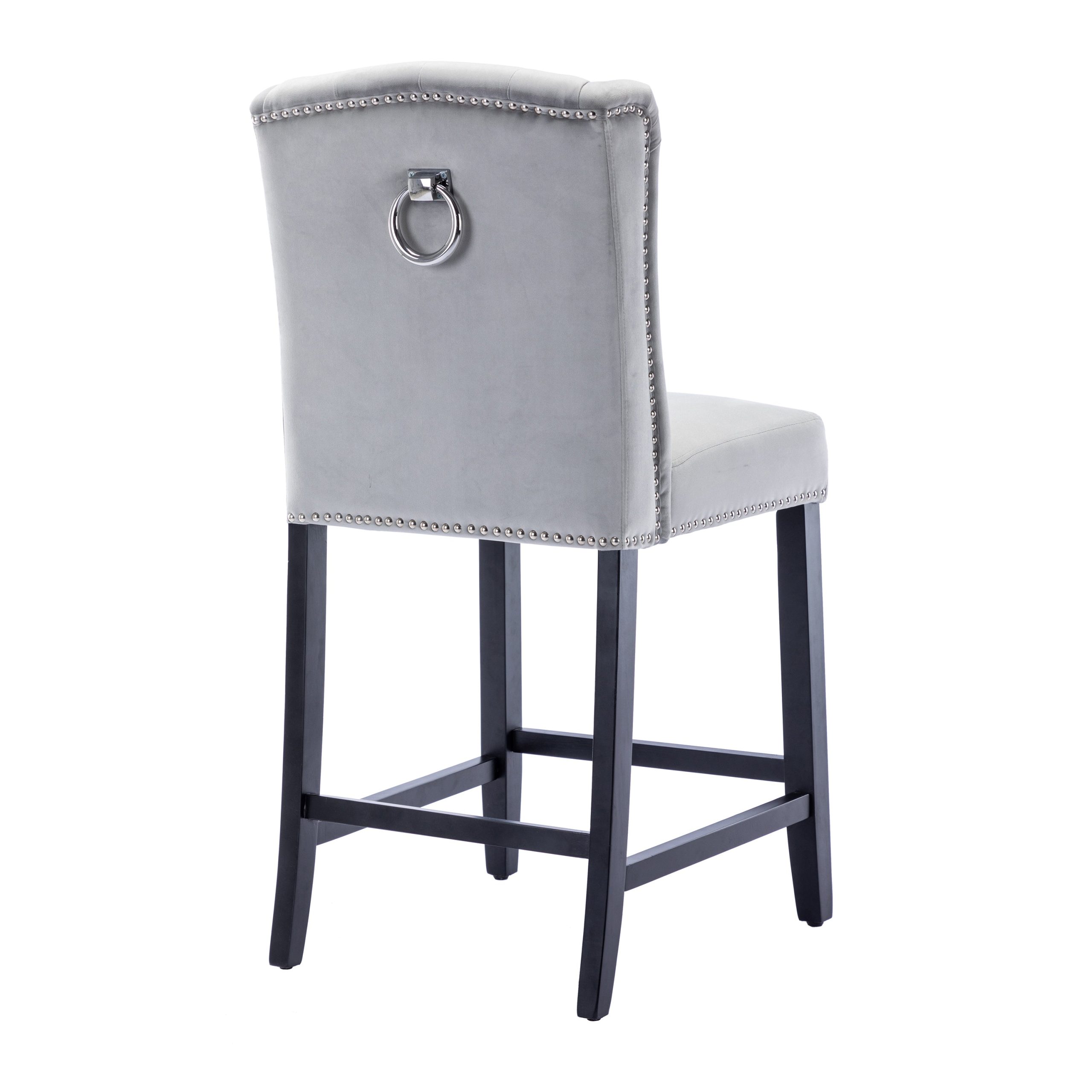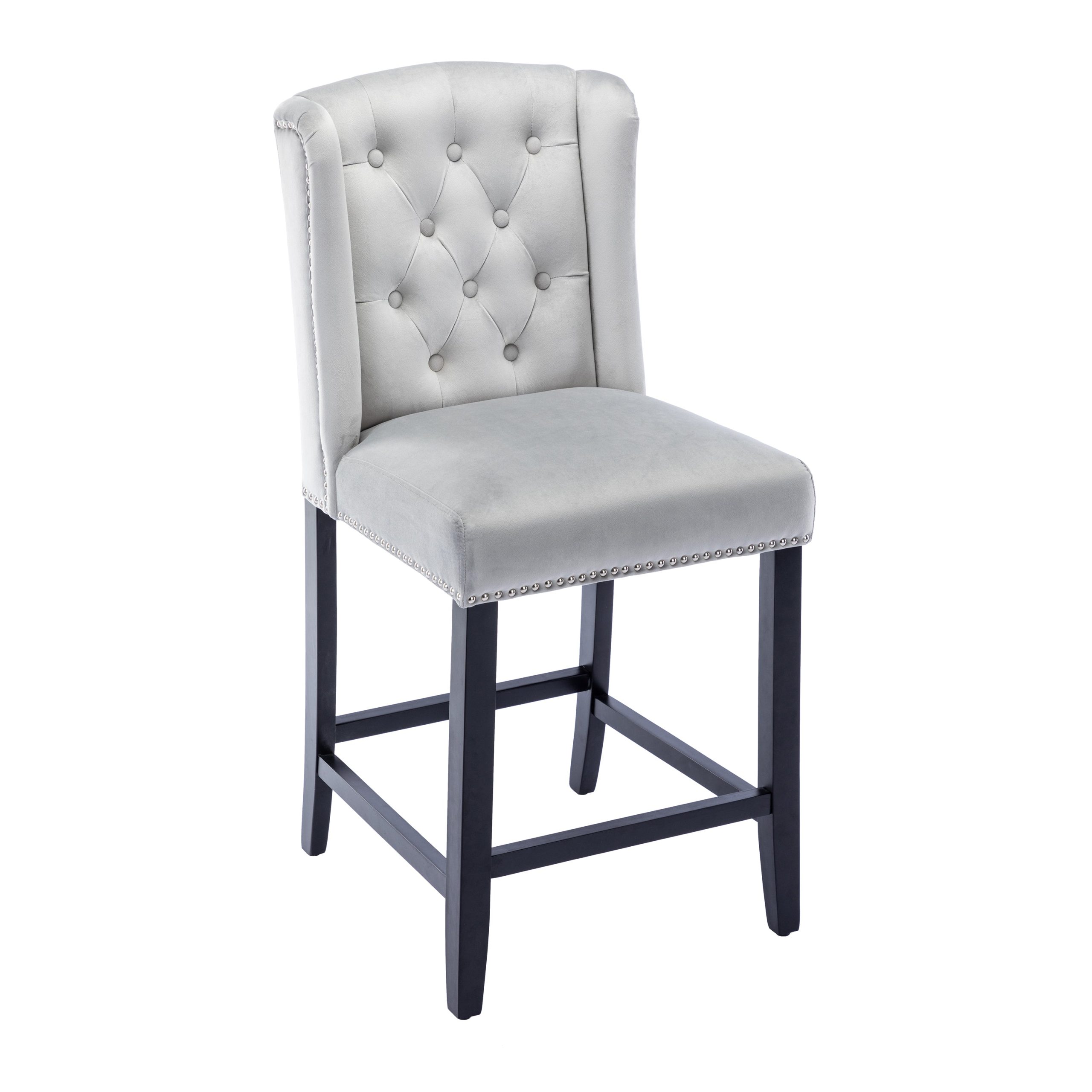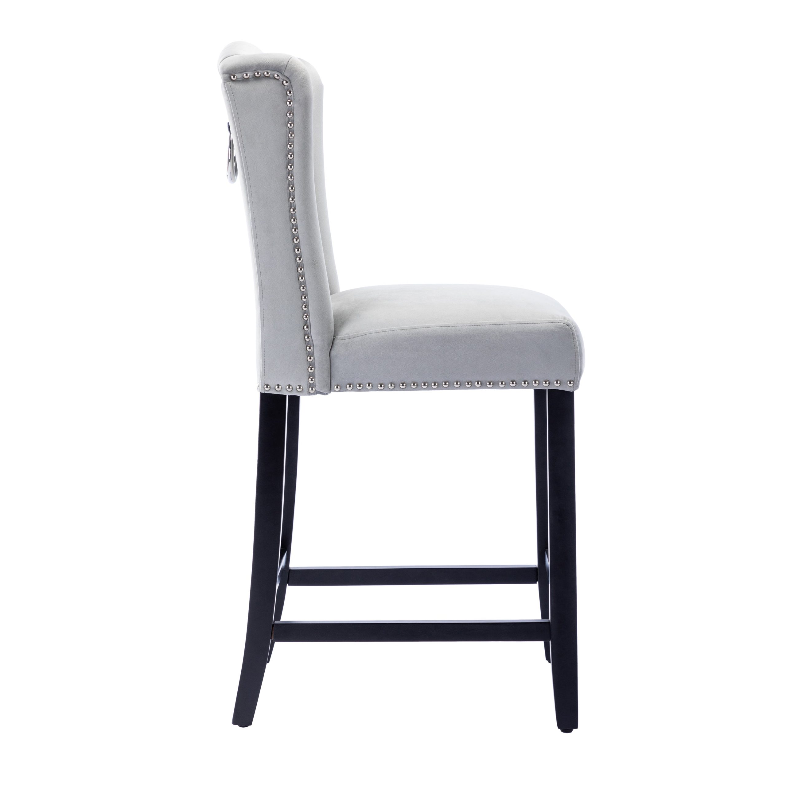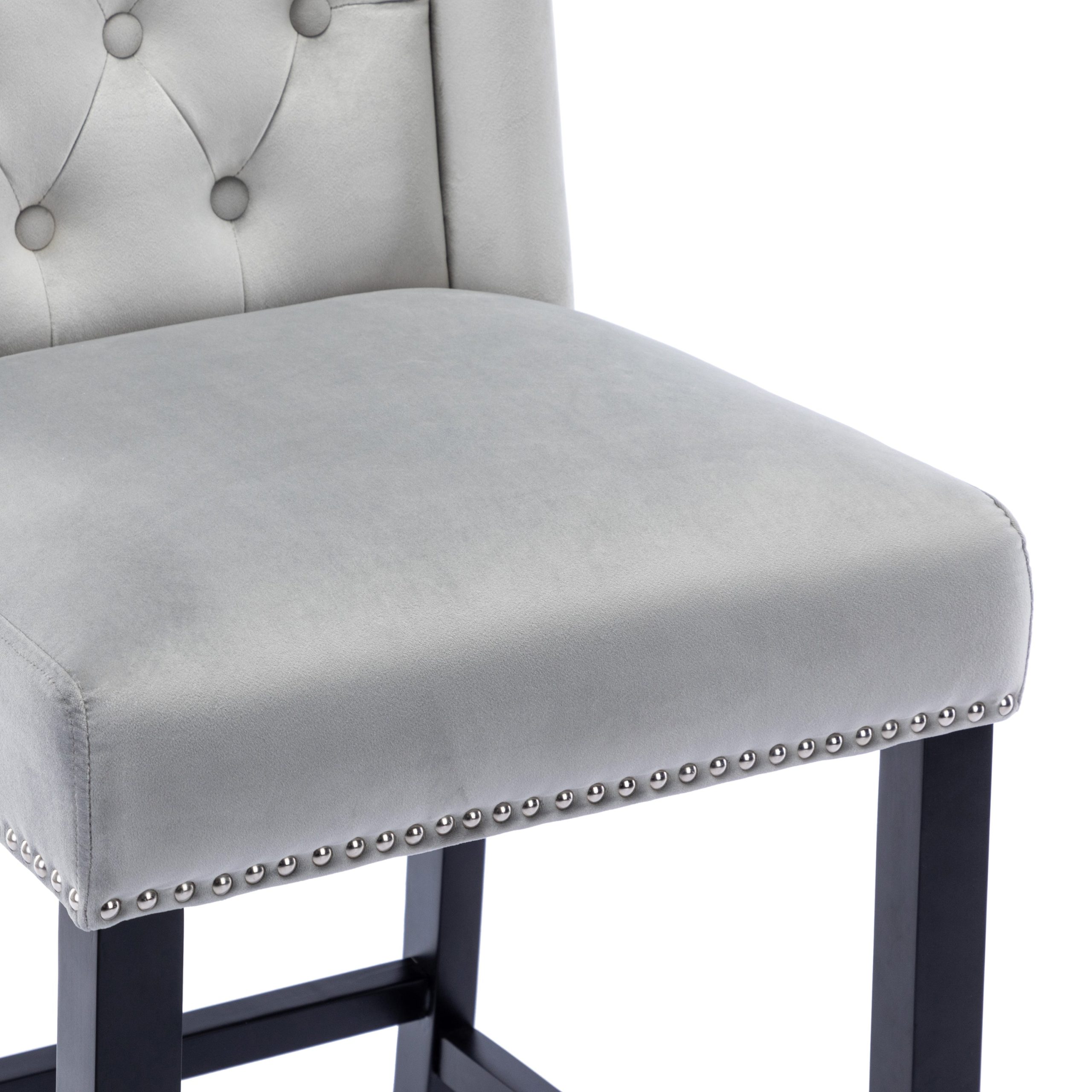 This bar stools set is perfect for elevated surfaces like bars, kitchen islands, and high dining tables. It features a tall backrest and a cushioned seat for a comfortable sitting experience. The combination of light gray upholstery and black frame creates a classic and neutral look.