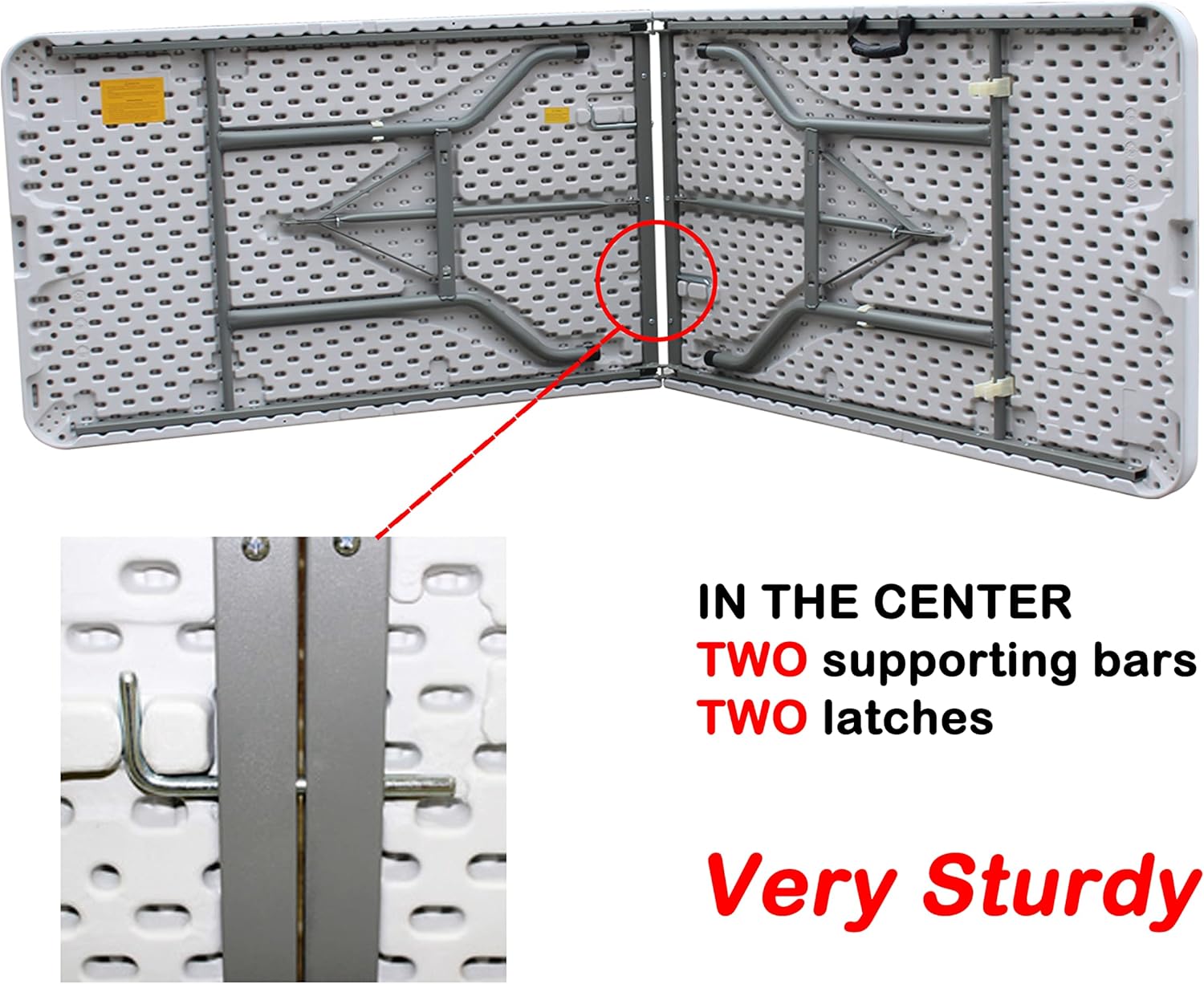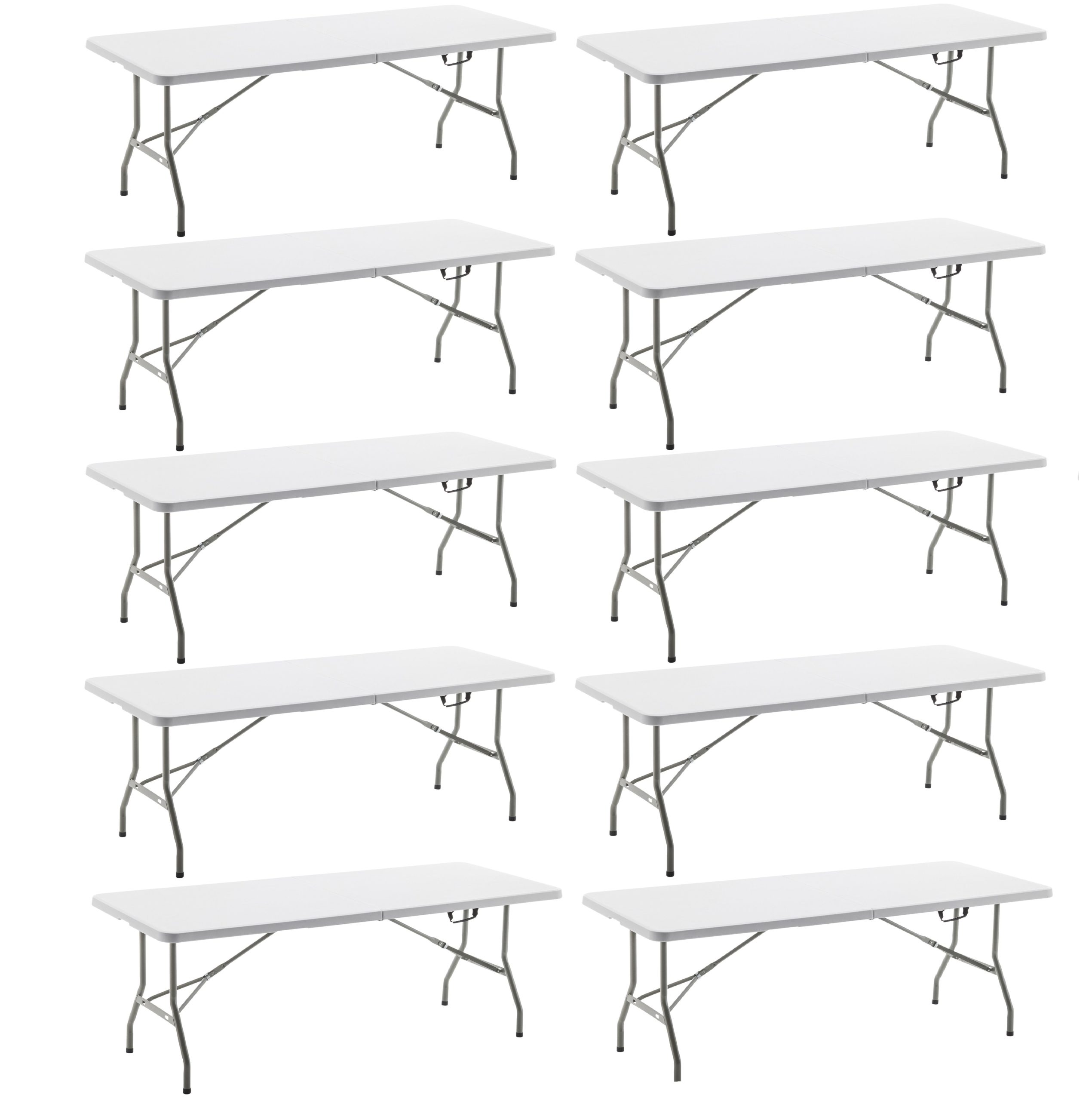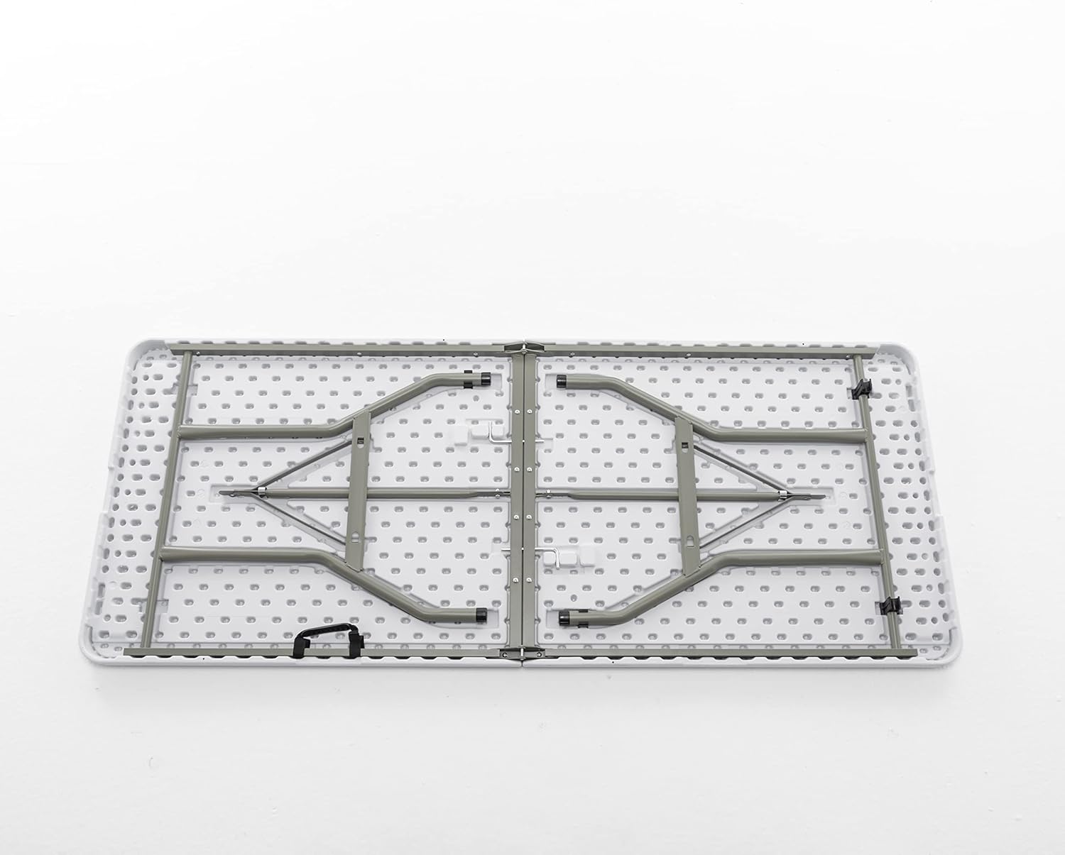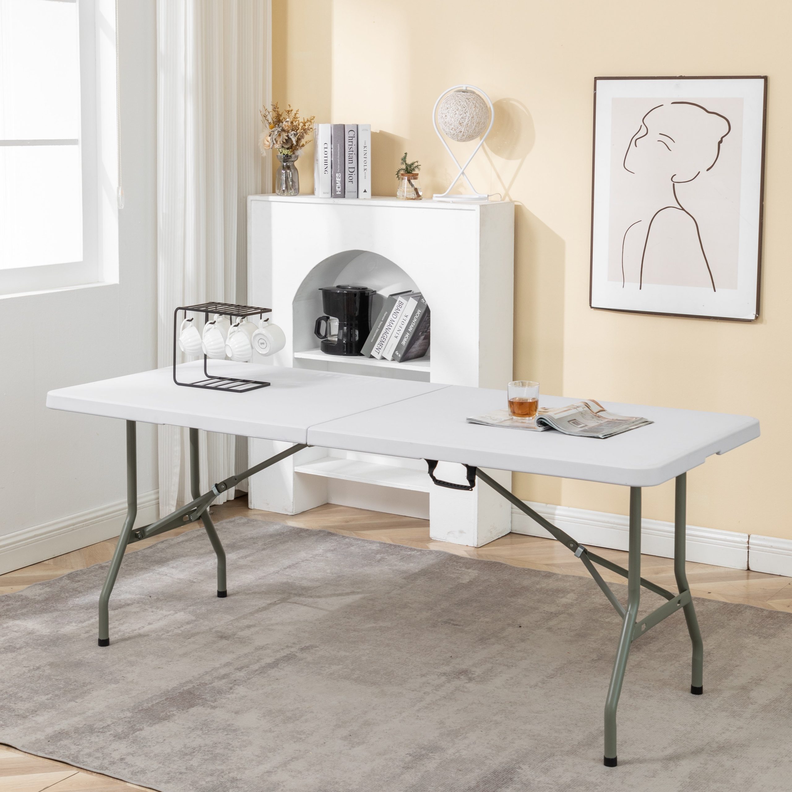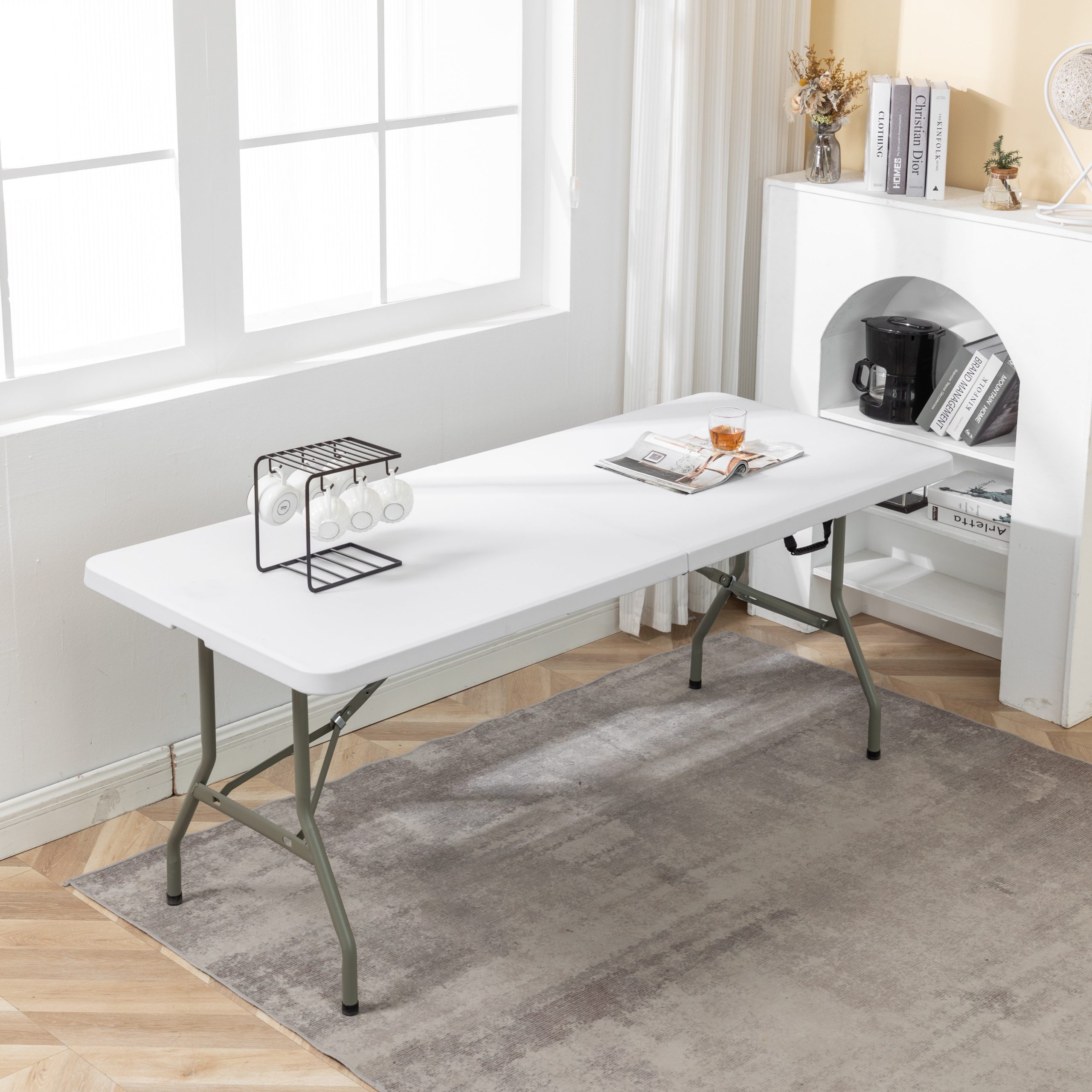 This folding utility table is a versatile solution for various needs. It features a durable plastic tabletop and metal legs, making it both sturdy and portable. With its foldable design, it can be easily stored and transported.