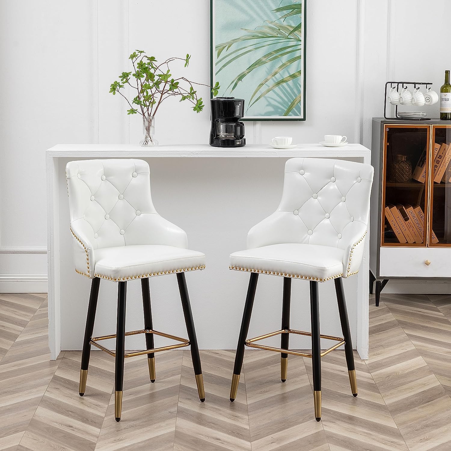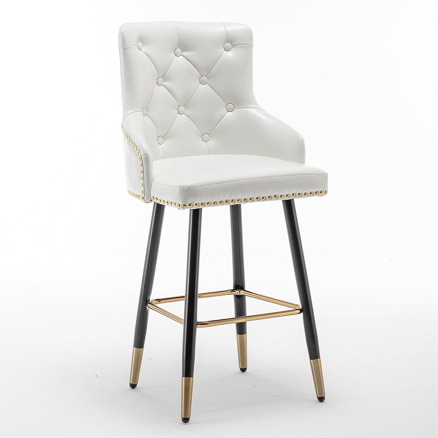 | Key Design Details | Tufted backrest with diamond – shaped pattern and white buttons, gold nailhead studs along edges of seat and backrest, black metal legs with slender, tapered profiles capped with gold – toned metal at bottom, gold metal crossbar footrest |