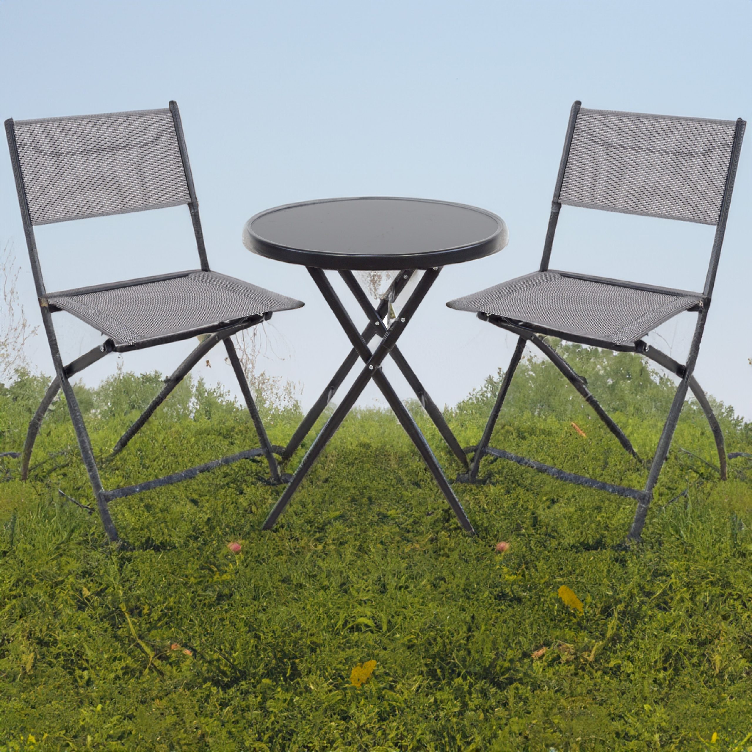 This is an outdoor folding bistro set perfect for small spaces. It comes with one round folding table and two folding chairs, offering a compact and functional seating solution. The set is designed to be used outdoors for various leisure activities.