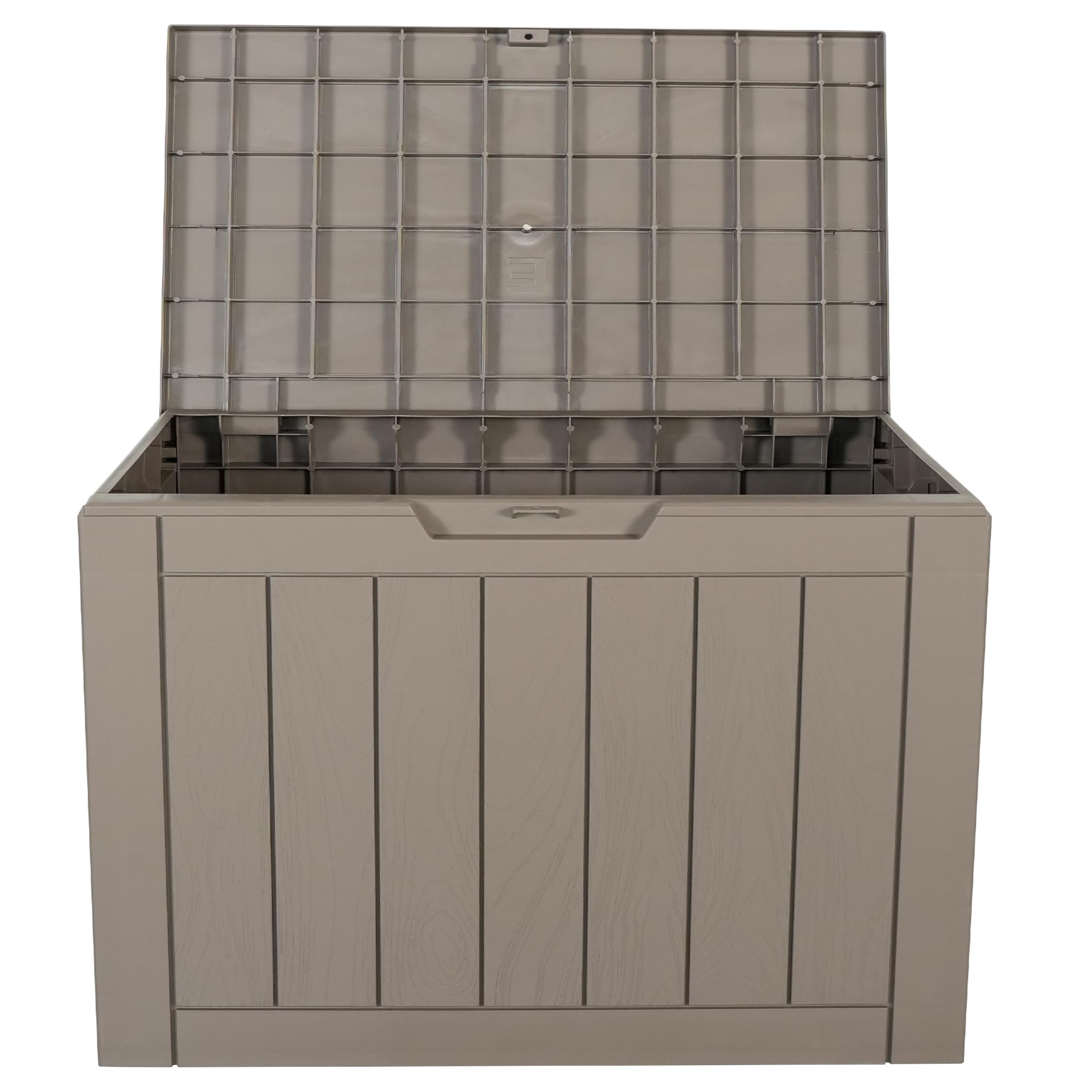 Pattern/Textures Embossed vertical wood – grain lines on front and side panels, grid – like reinforcement pattern on lid