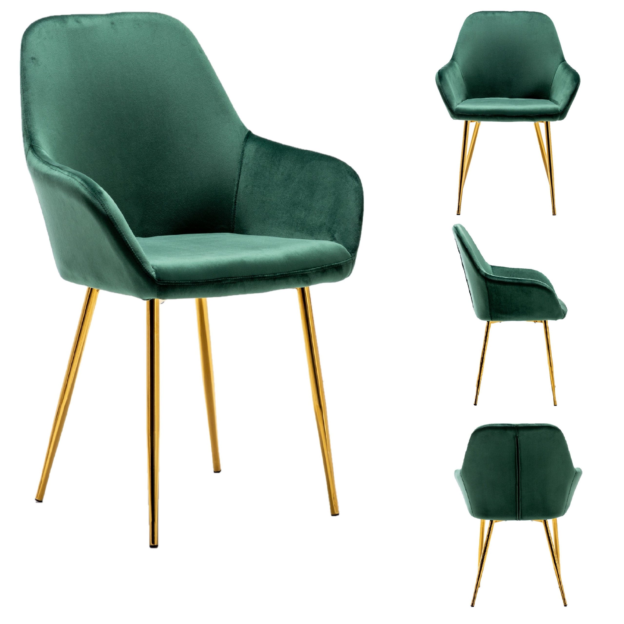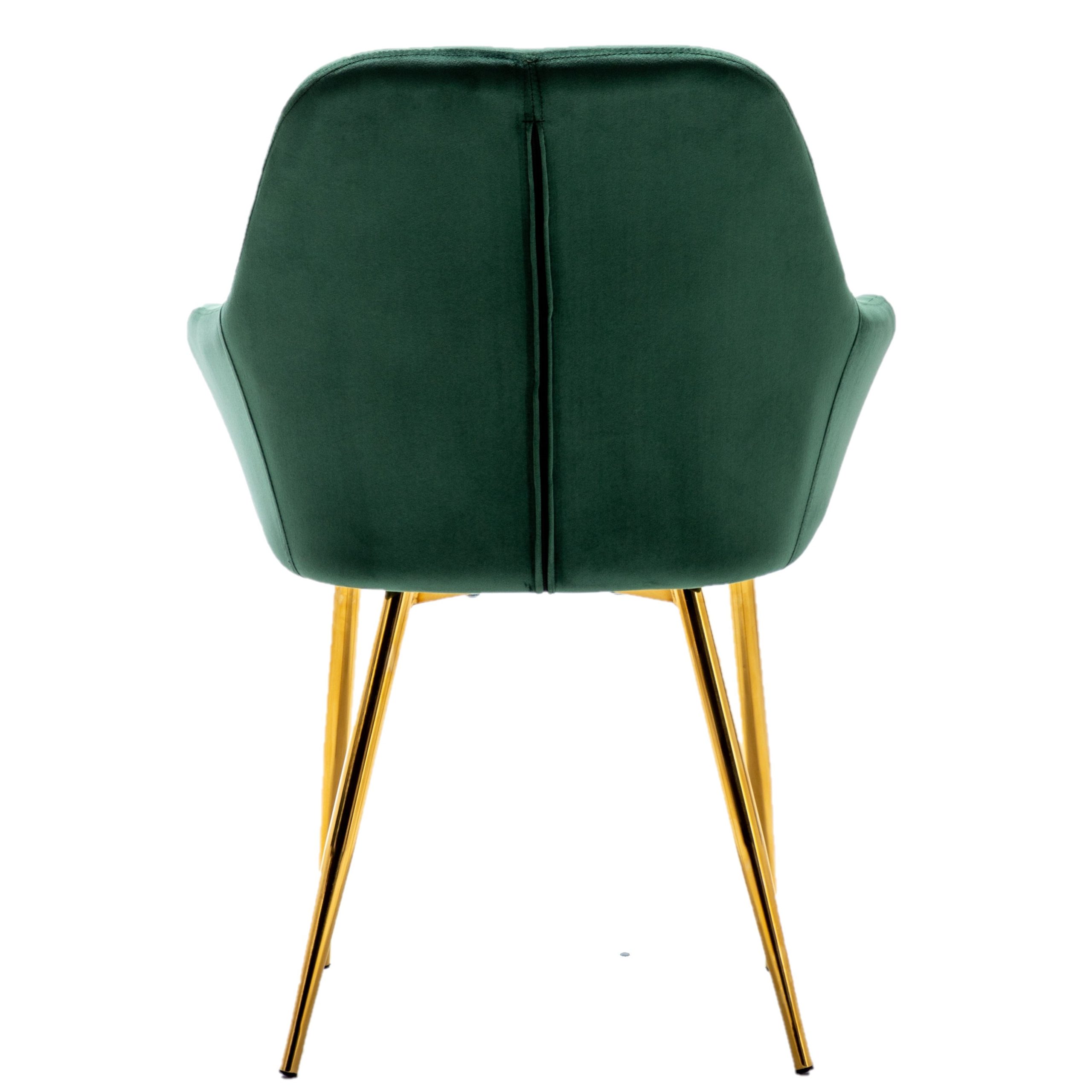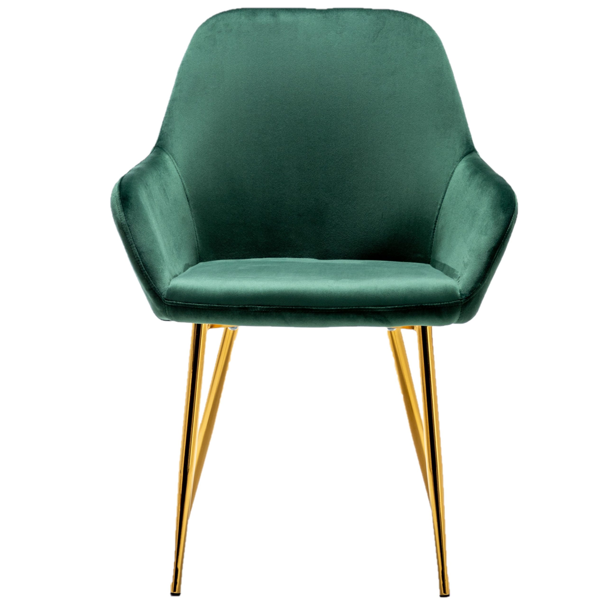 This modern upholstered armchair is a versatile piece that can be used for dining or as an accent in various rooms. Its rich green velvet upholstery and gold tapered legs create a bold and elegant look, while the rounded back and padded armrests offer comfort.