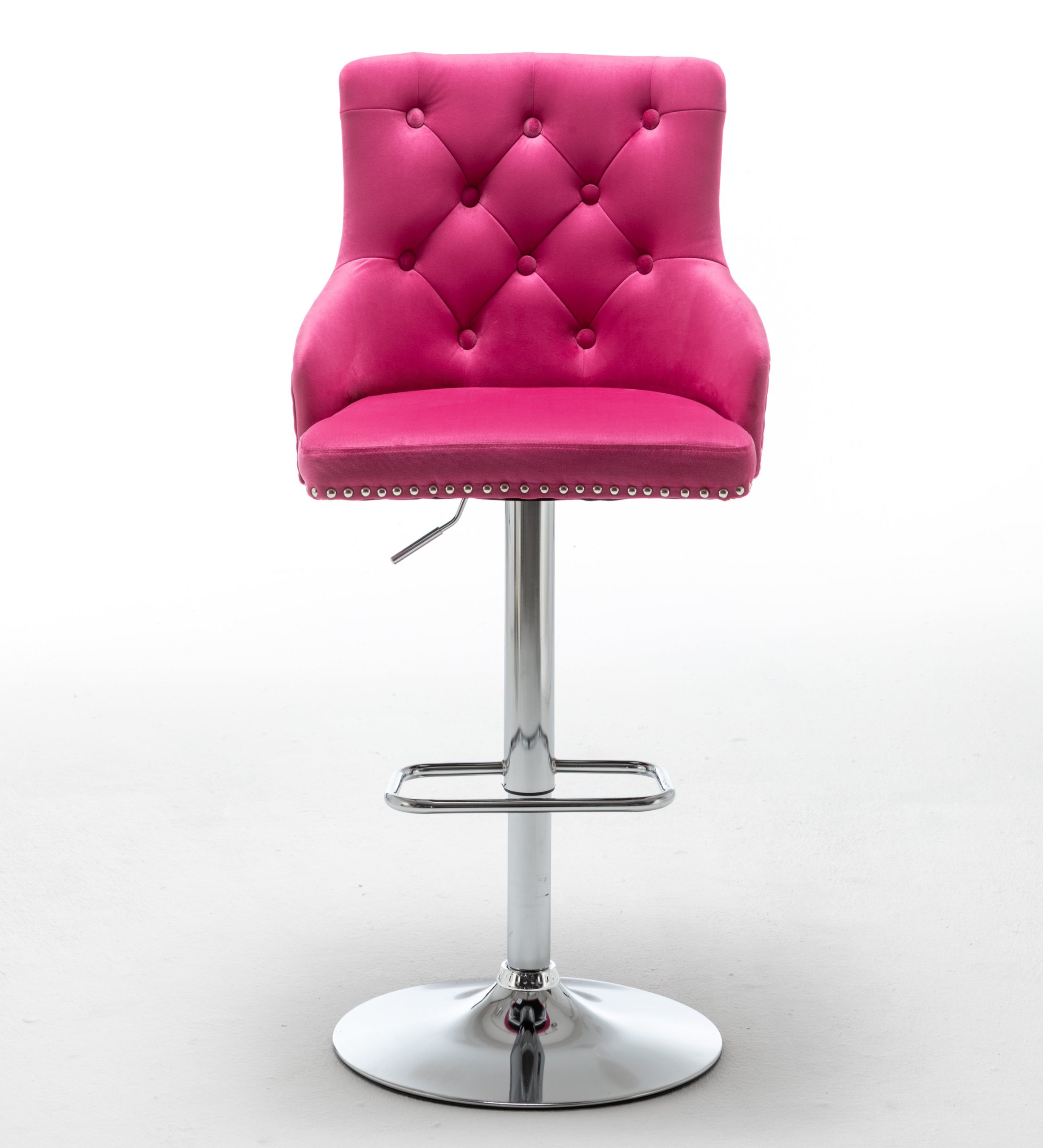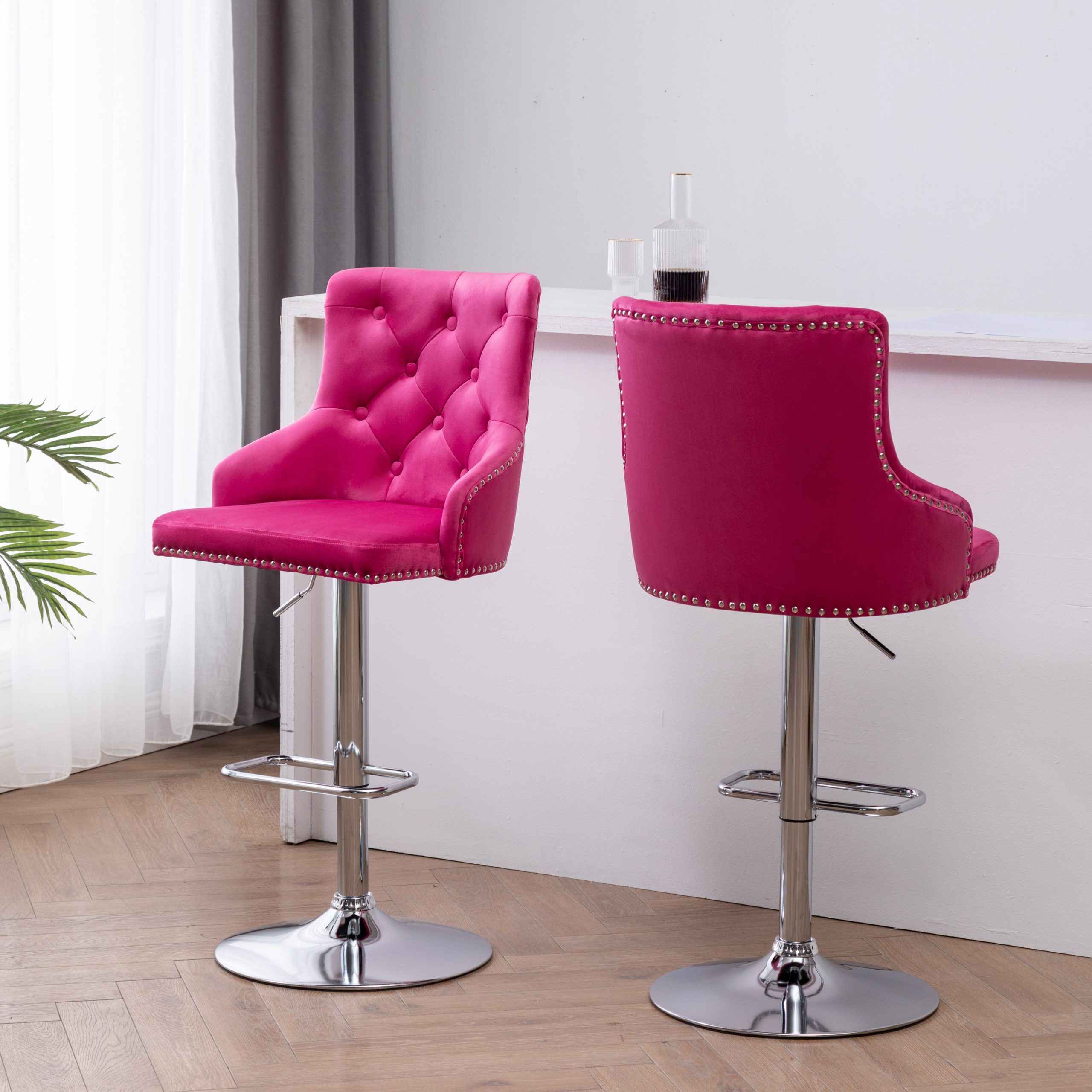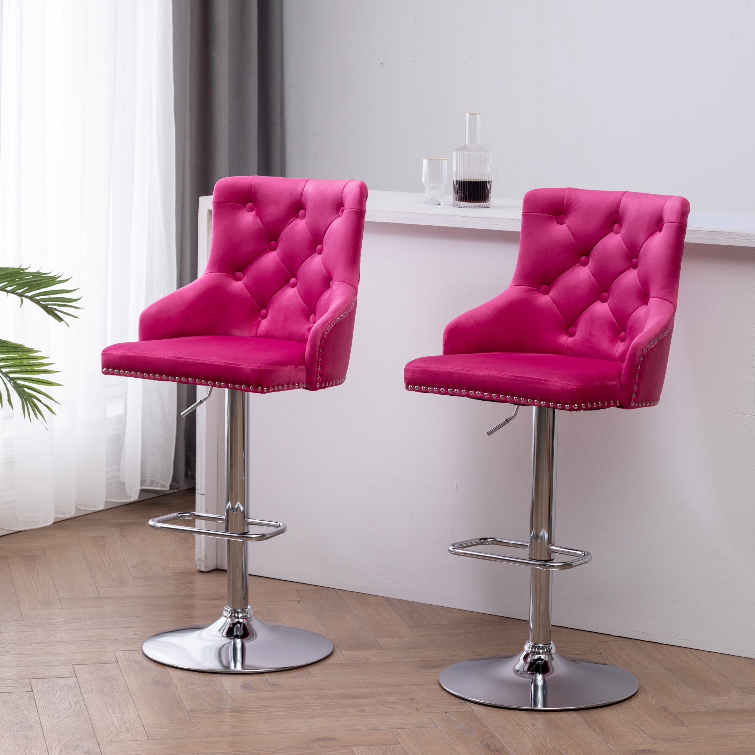 This bar stool is a perfect blend of style and functionality. With its vibrant magenta upholstery and decorative details, it can be a focal point in any space. It’s designed for use at bars, kitchen islands, or high counters, offering both comfort and support.