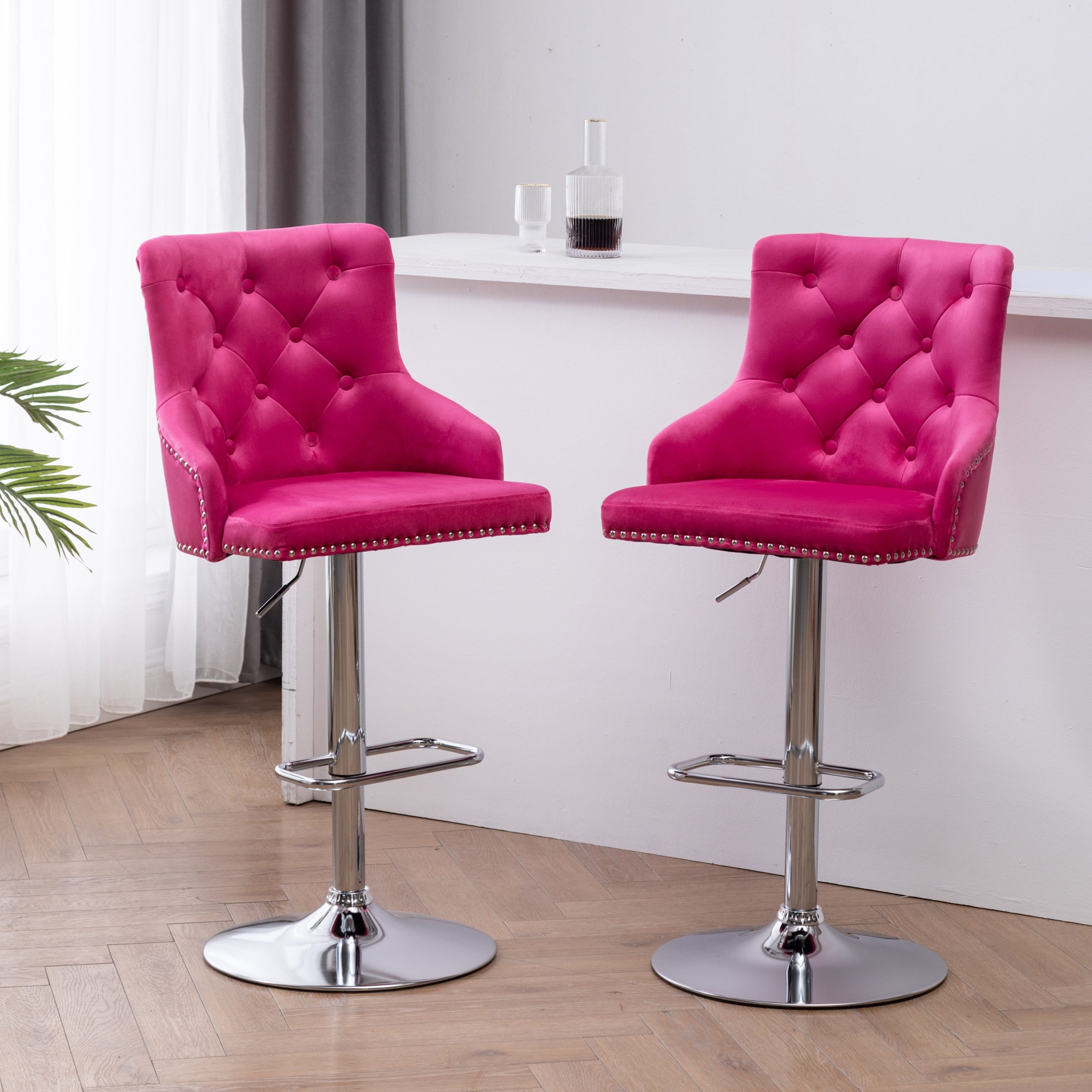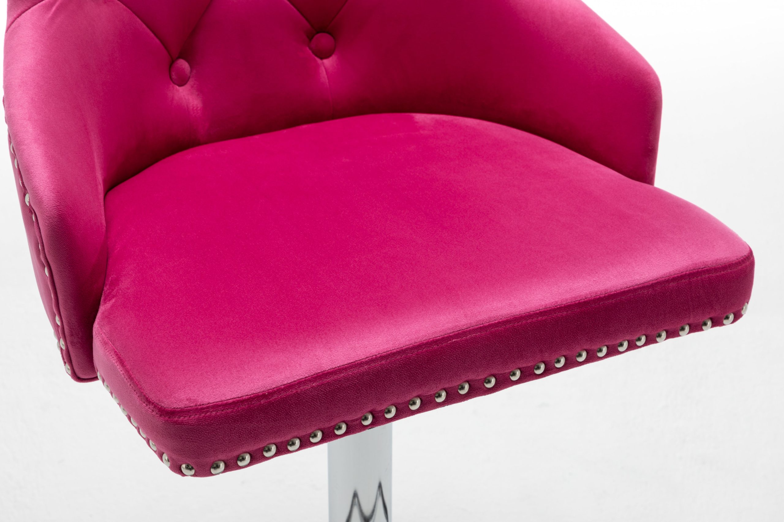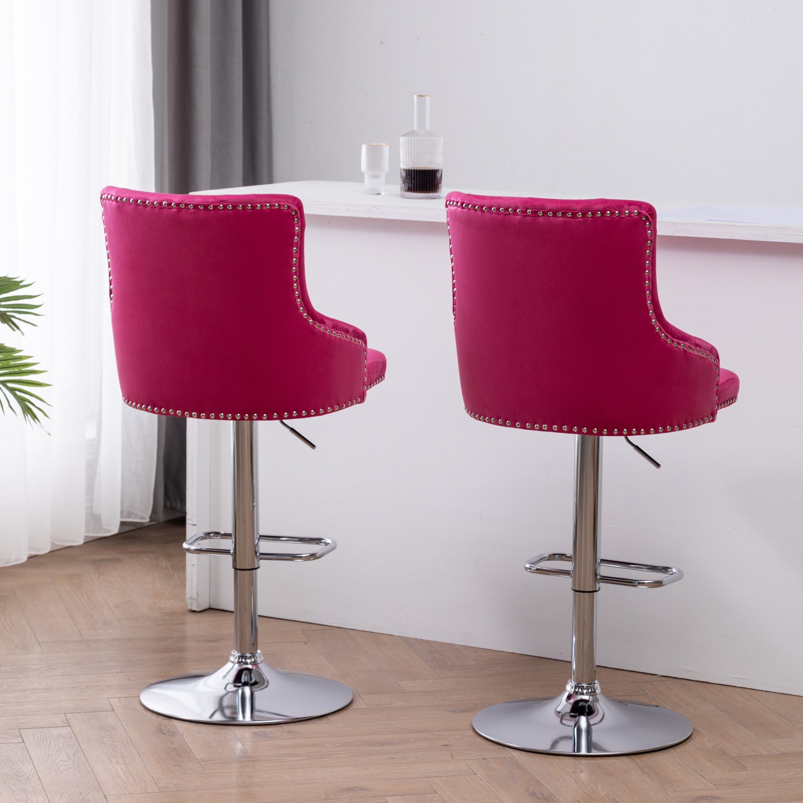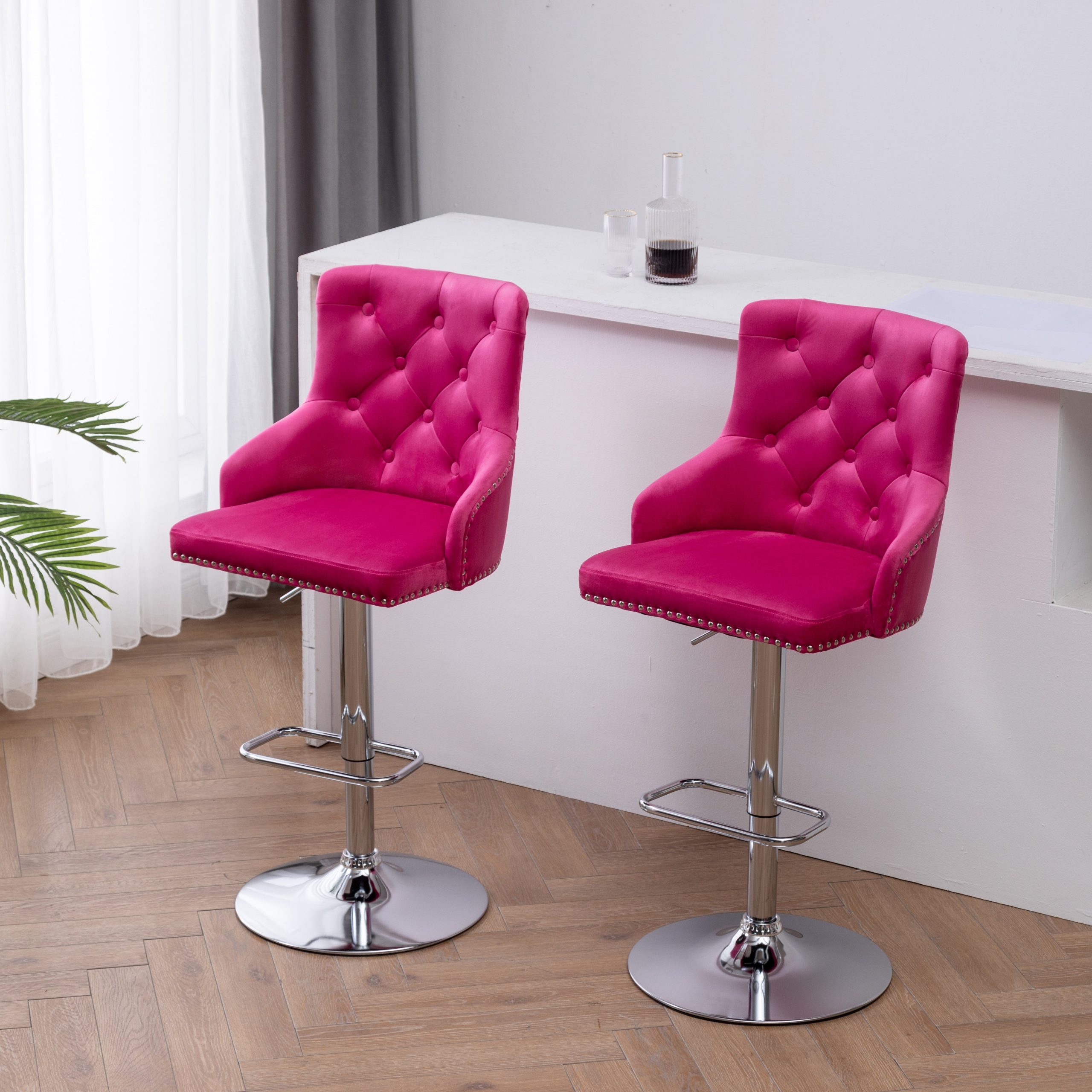 This bar stool is a perfect blend of style and functionality. With its vibrant magenta upholstery and decorative details, it can be a focal point in any space. It’s designed for use at bars, kitchen islands, or high counters, offering both comfort and support.
