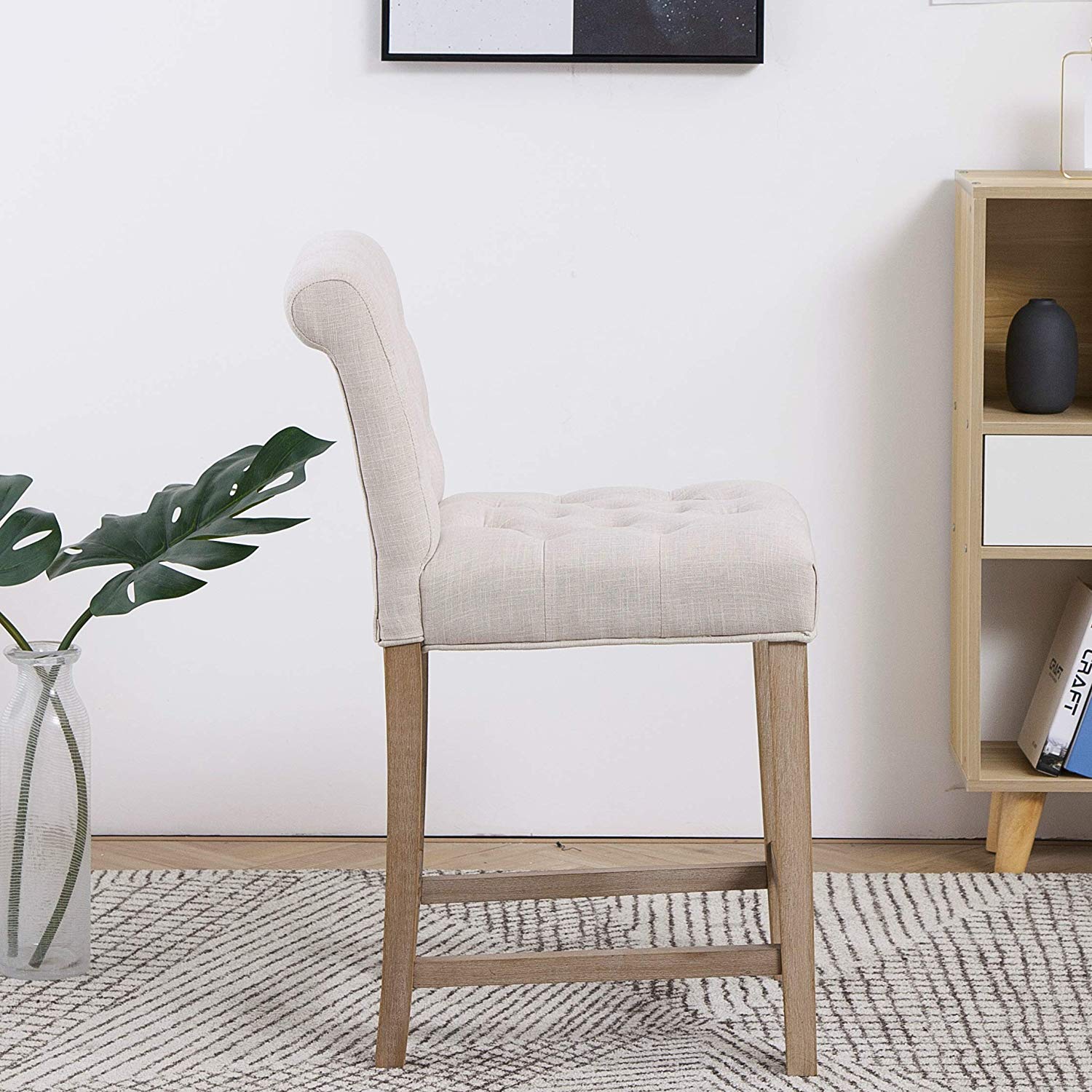 | Design Elements | Button tufting in diamond pattern on seat and backrest, clean modern lines, tall curved backrest, slightly padded rectangular seat, sturdy wooden legs with lower crossbar footrest |