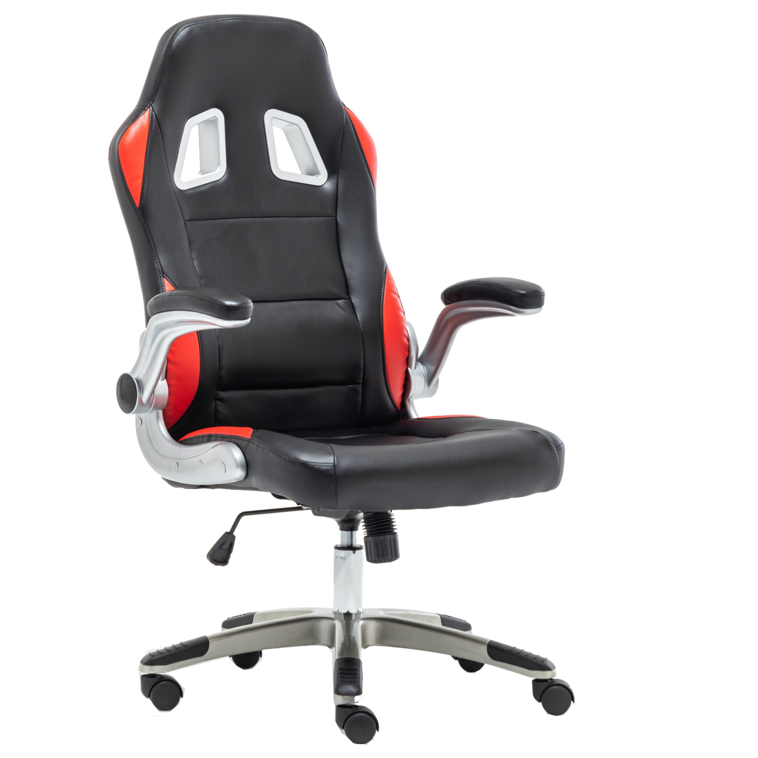 Design Elements Backrest with two symmetrical, cut – out panels (white/silver trim), angled armrests with metallic frame and cushioned black tops, five – point base with black rubber foot caps