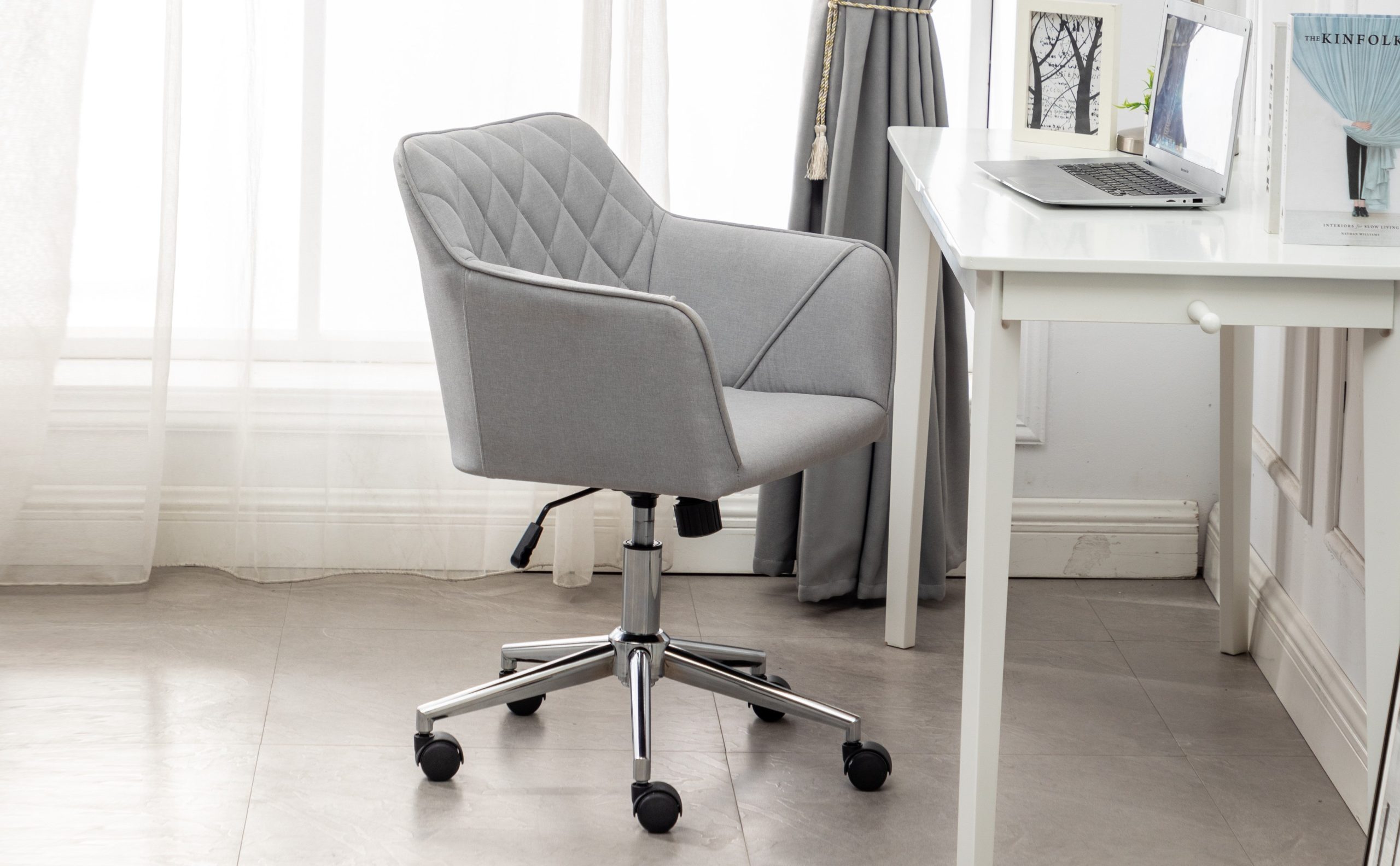 This is an ideal office chair for work desks and study tables. It combines mobility, adjustability, and ergonomic features, offering a comfortable seating experience for extended work hours. The light gray fabric upholstery gives it an elegant look that suits various decor styles.