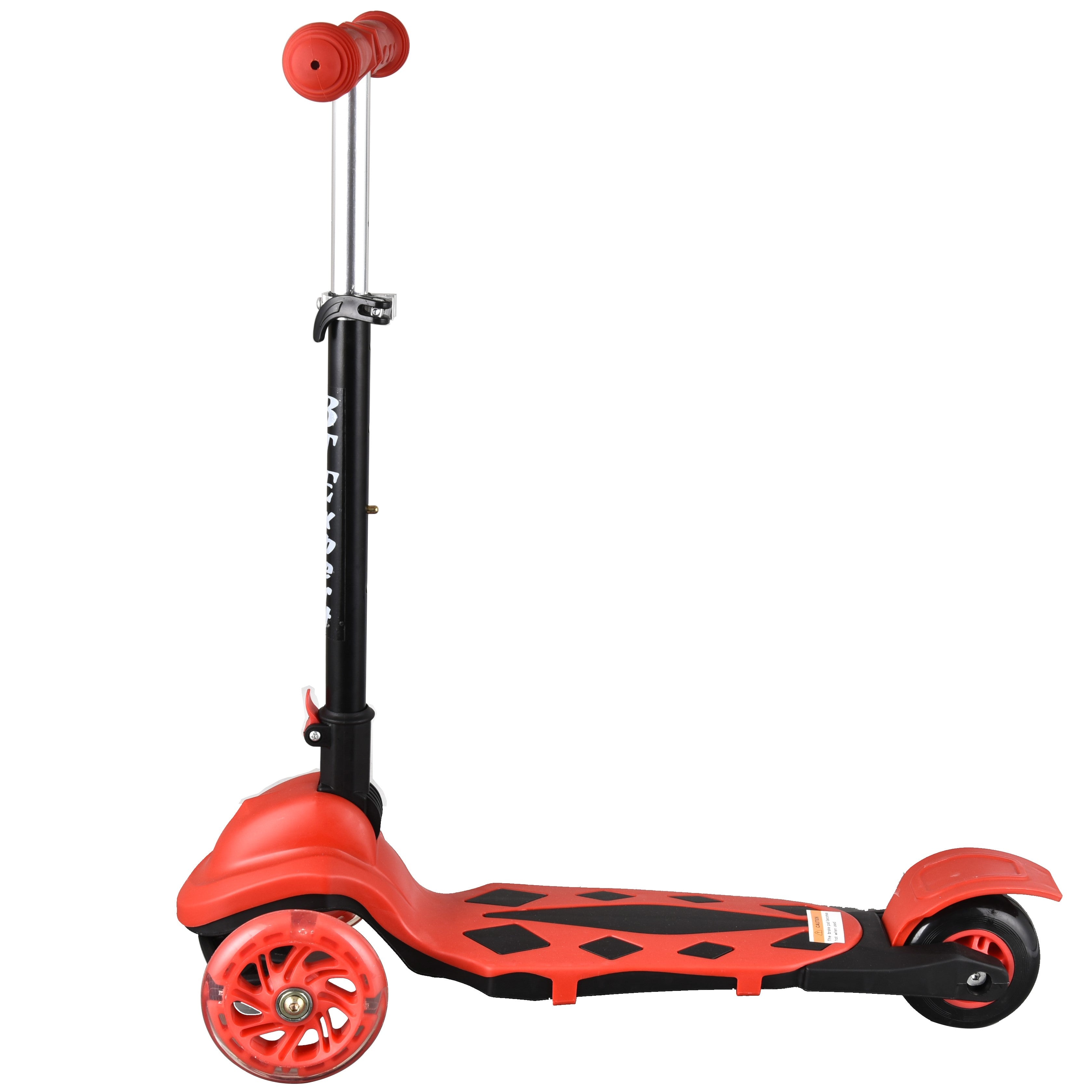 | Color | Dominant red (wheels, handlebar grips, deck fenders) and black (stem, deck patterns, structural parts), with white text accents |