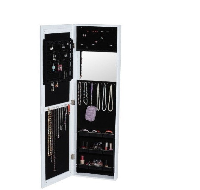 This wall-mounted jewelry armoire is a practical and stylish solution for organizing your jewelry and accessories. It offers a full-length mirror for styling and a variety of compartments to keep your items safe and organized.